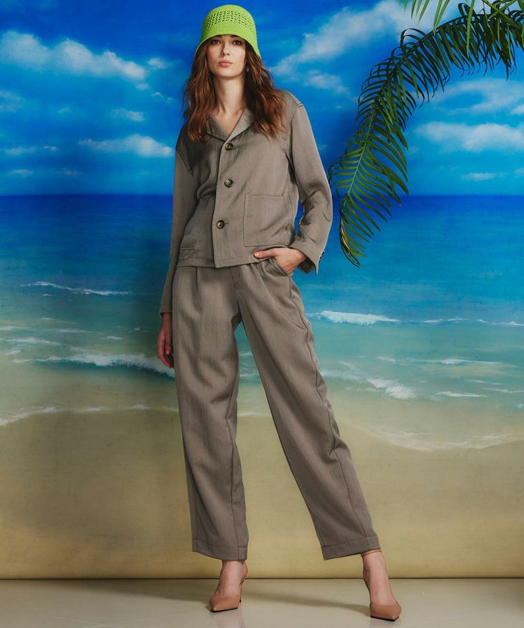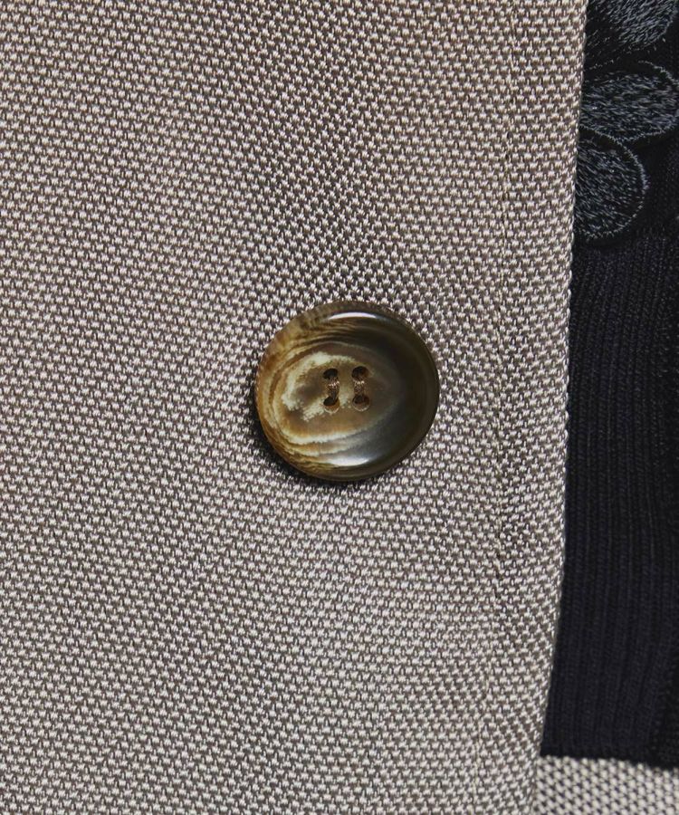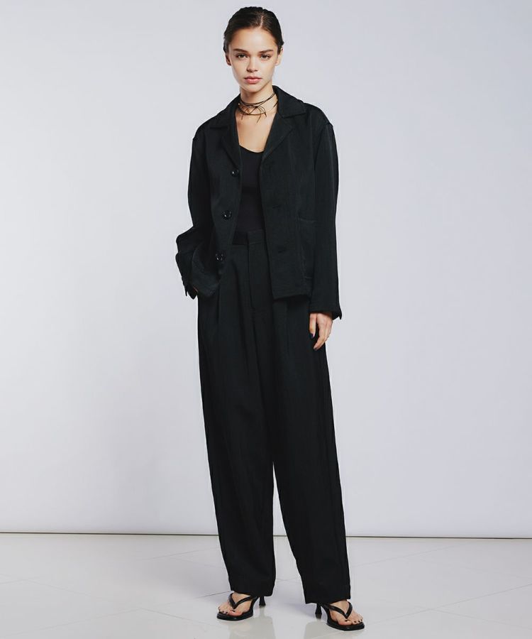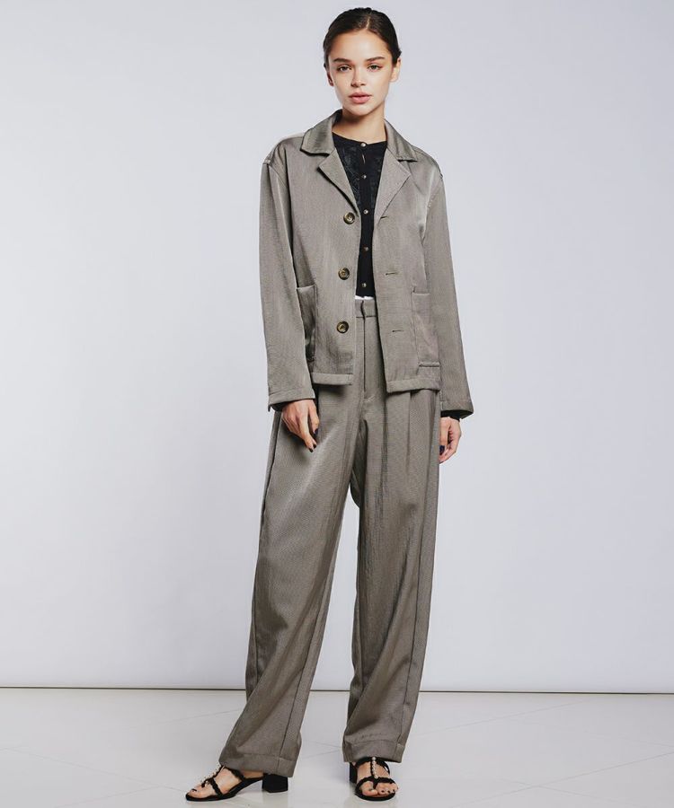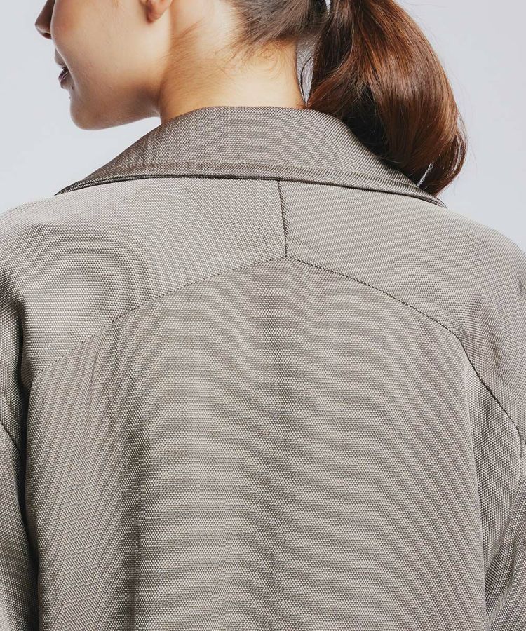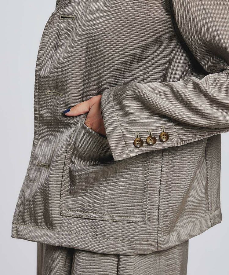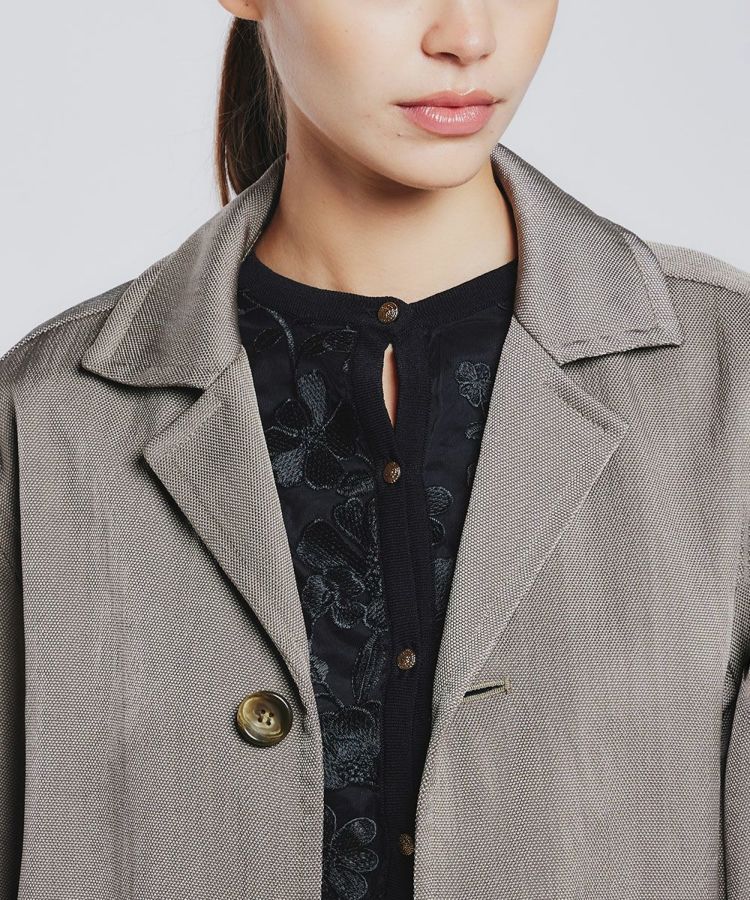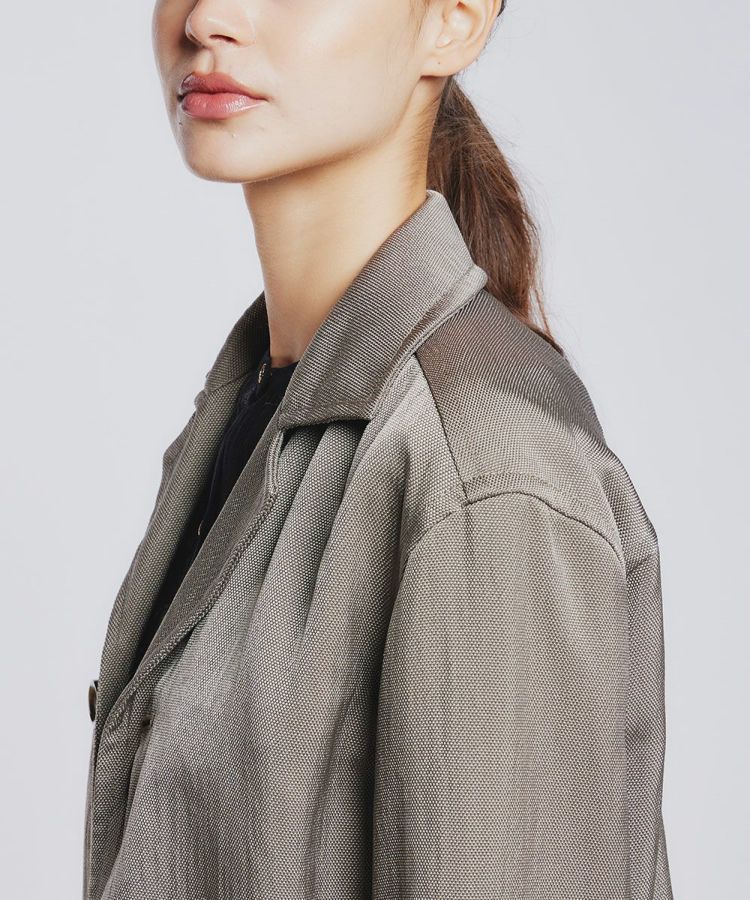 テロンとした落ち感が女性らしいムードを演出するジャケット。ブライト糸を使用した軽やかなナイロン生地で、上品な光沢感が特徴です。また、オックス組織の表情を活かしつつ、塩縮加工を施し雰独特の風合いに。Tシャツを合わせるだけで、こなれ感のあるジャケットスタイルが叶う一着です。同素材のパンツ(型番0306261241)とのセットアップスタイルはもちろん、ボトムを選ばない丈感なので合わせやすいのも魅力。さらりと羽織れて決まる、季節の変わり目に重宝するアイテムです。