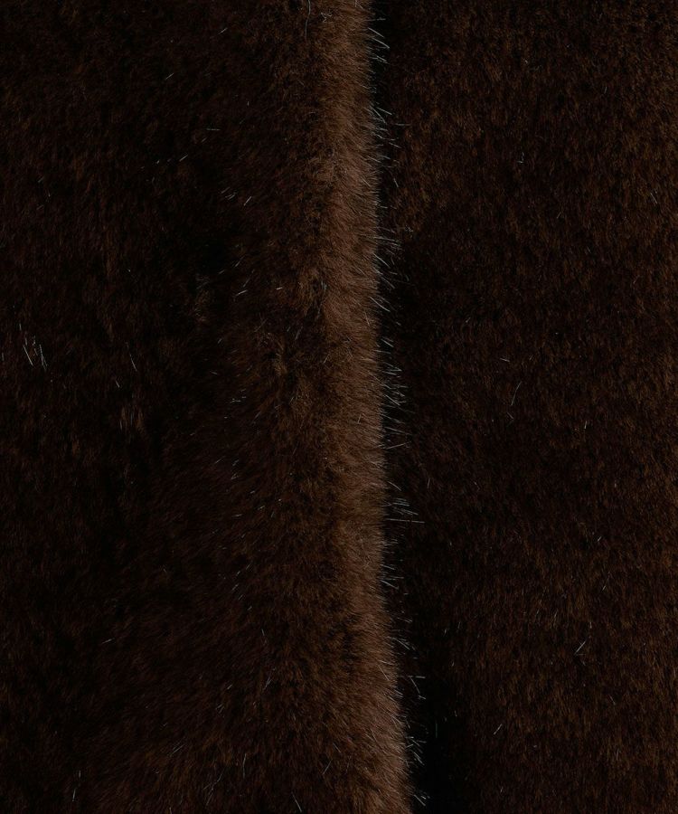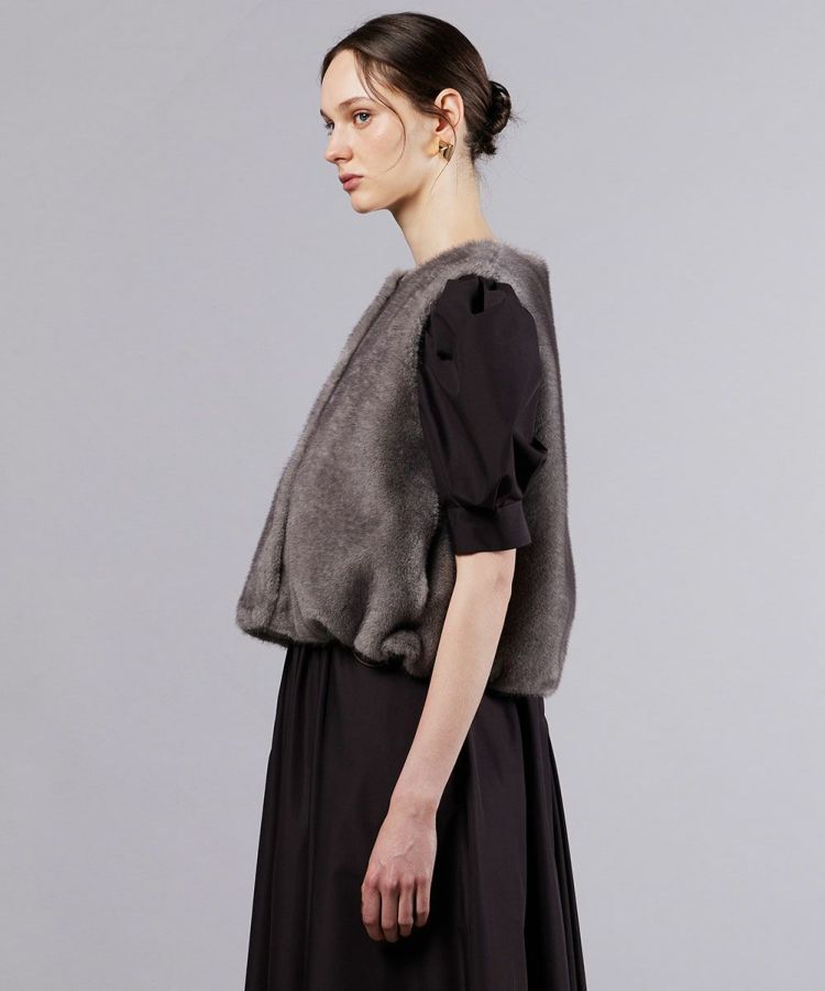 上品な光沢をまとった、高級感漂うファーベスト。ポリエステルファーを丁寧にトリミングし、毛先には差し毛カラーを入れたことで、本物のミンクのような立体感と風合いを再現しました。リュクス感がありながらも軽やかで快適な着心地をキープ。シンプルなカットソーやニットの上から羽織るだけで、エレガントな装いが完成します。