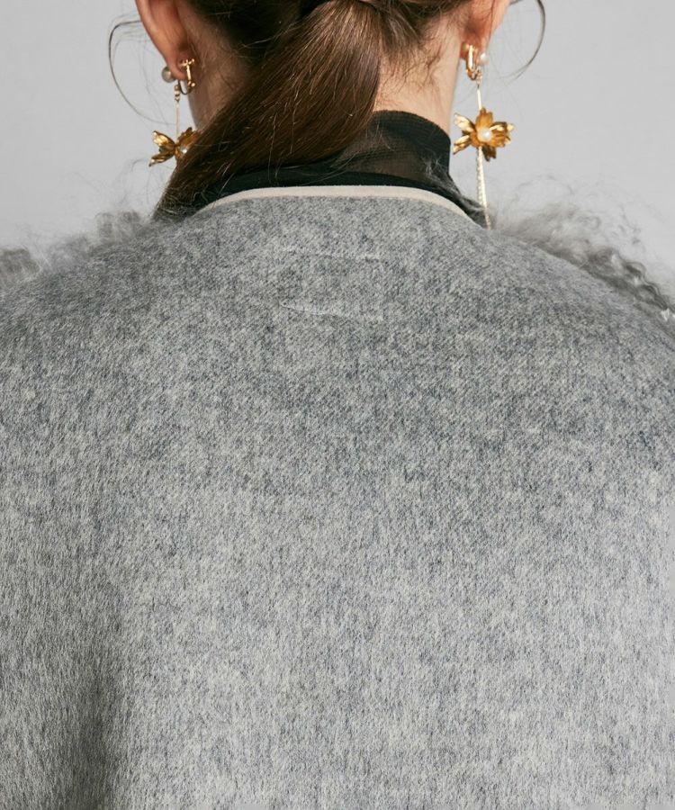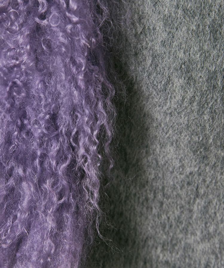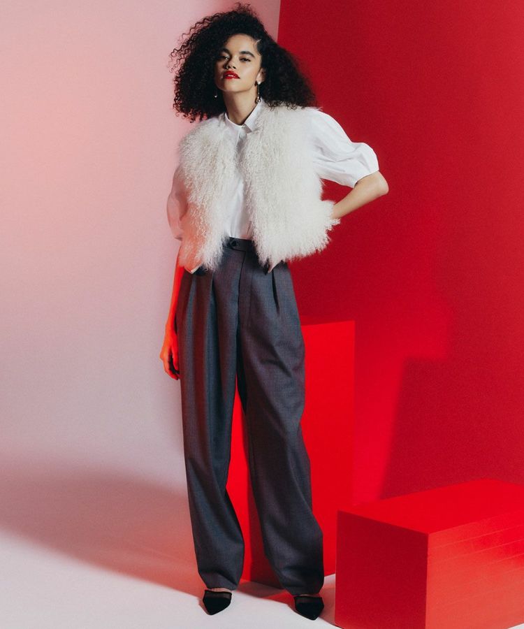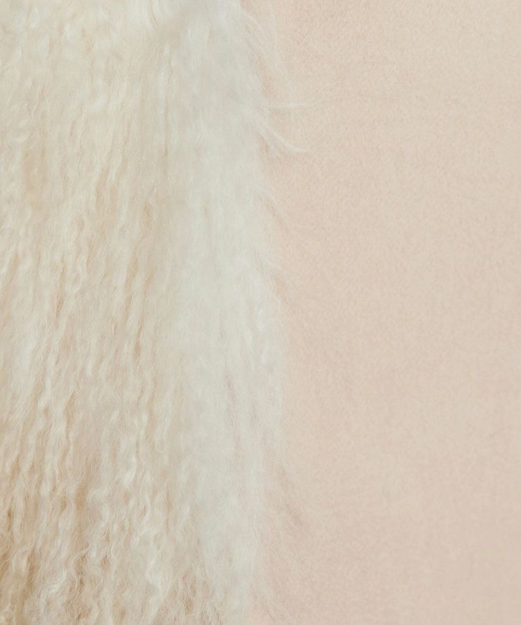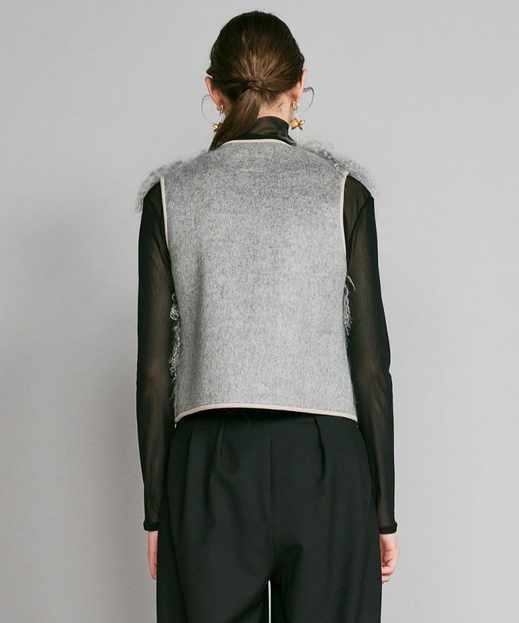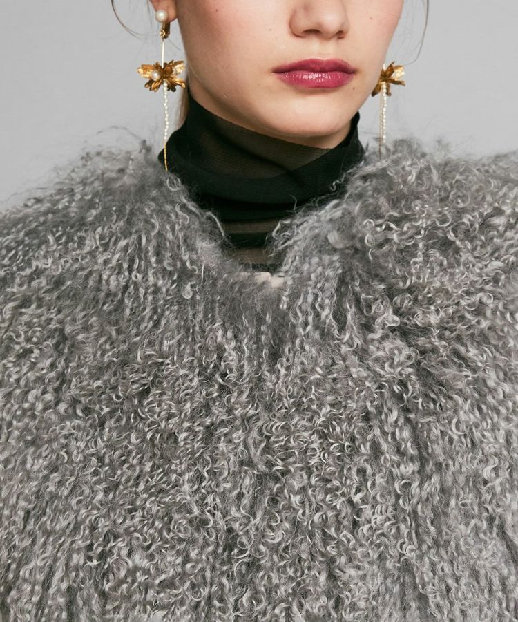 ふんわりとしたボリューム感がかわいいファーベスト。毛皮によくある刺し毛は存在しないタイプで、根元はストレート、毛先はカールした巻き毛を使用しています。マフラーなどに使われるチベット地方が原産のウールを採用し、5~8cmの長めの毛足が特徴。白い毛をブリーチしてから染めることにより、都会的な雰囲気に仕上げているのが新鮮です。リッチ感があるのでシャツやタートルネックに合わせるだけでコーディネートに華を添えてくれるアイテムです。