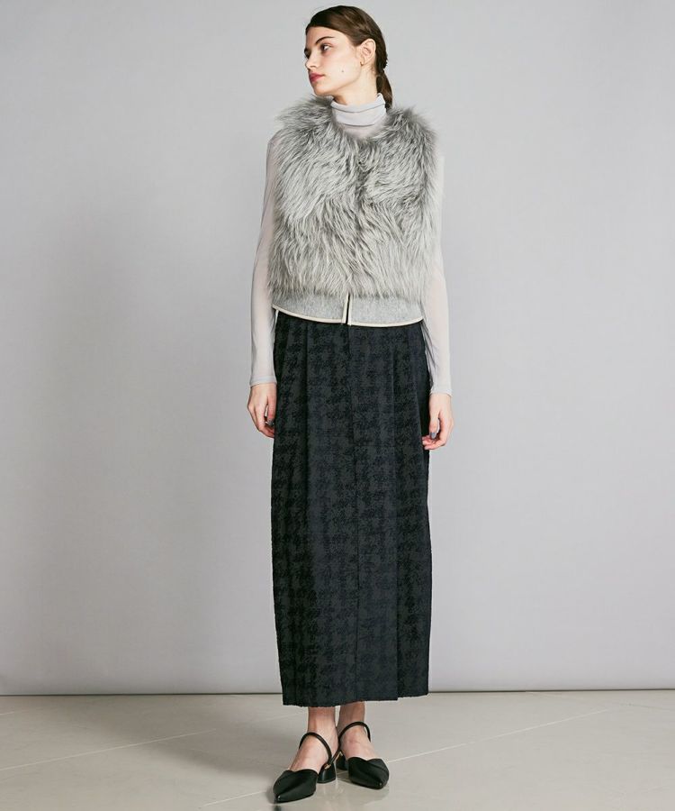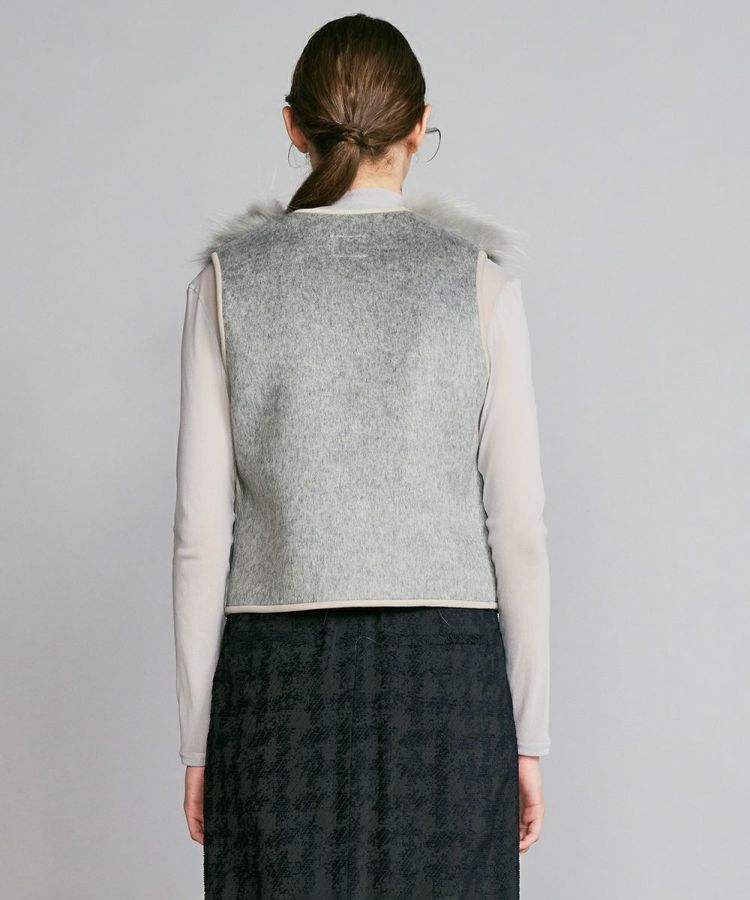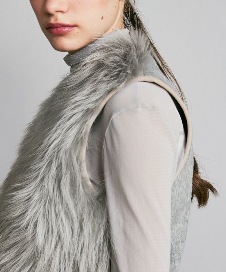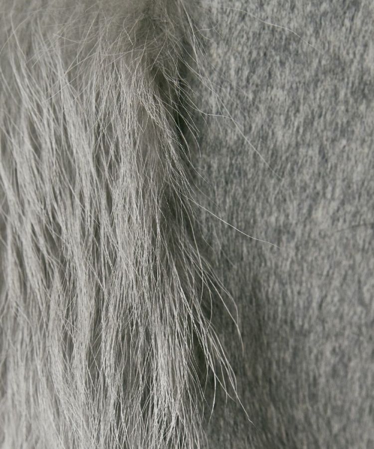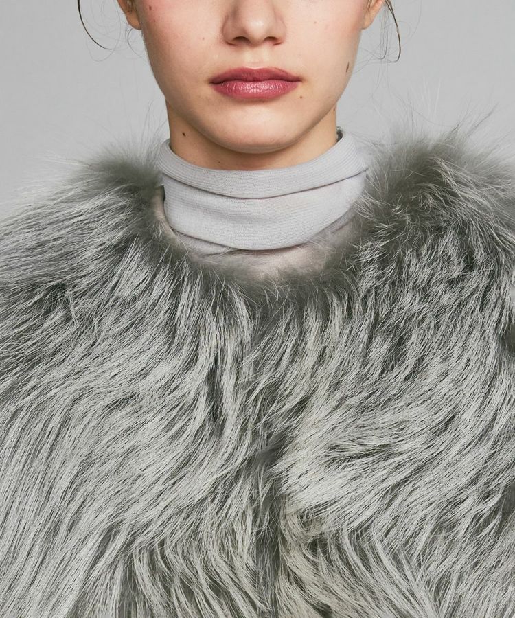 コンパクトなフォルムと豊かなラクーンファーがかわいいベスト。ラクーンはフォックス同様、差し毛と毛が存在する種類の毛皮で、フォックスより差し毛が長く目立つのが特徴です。裏面からパンチング加工を入れることで皮を伸ばし、軽さや綿毛のボリュームを調整しています。バックスタイルはファーはあしらわずすっきりと仕上げており、エレガントながらも都会的なスタイルに馴染むアイテムです。