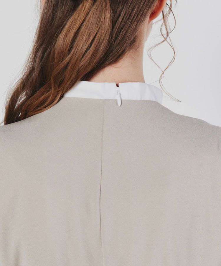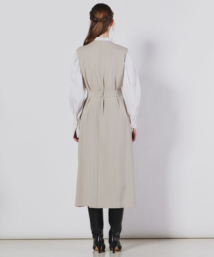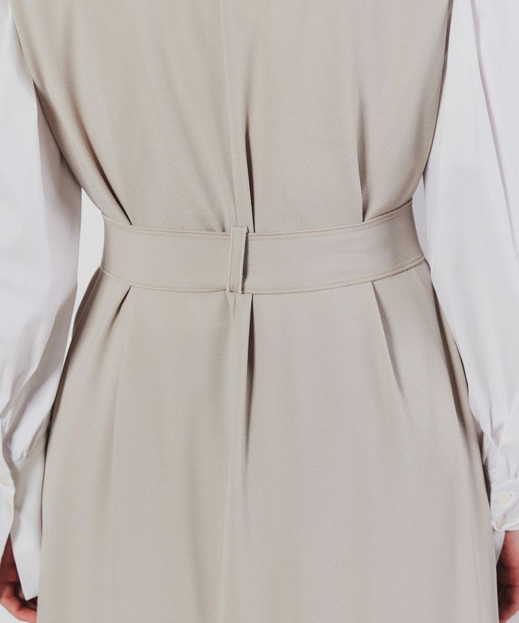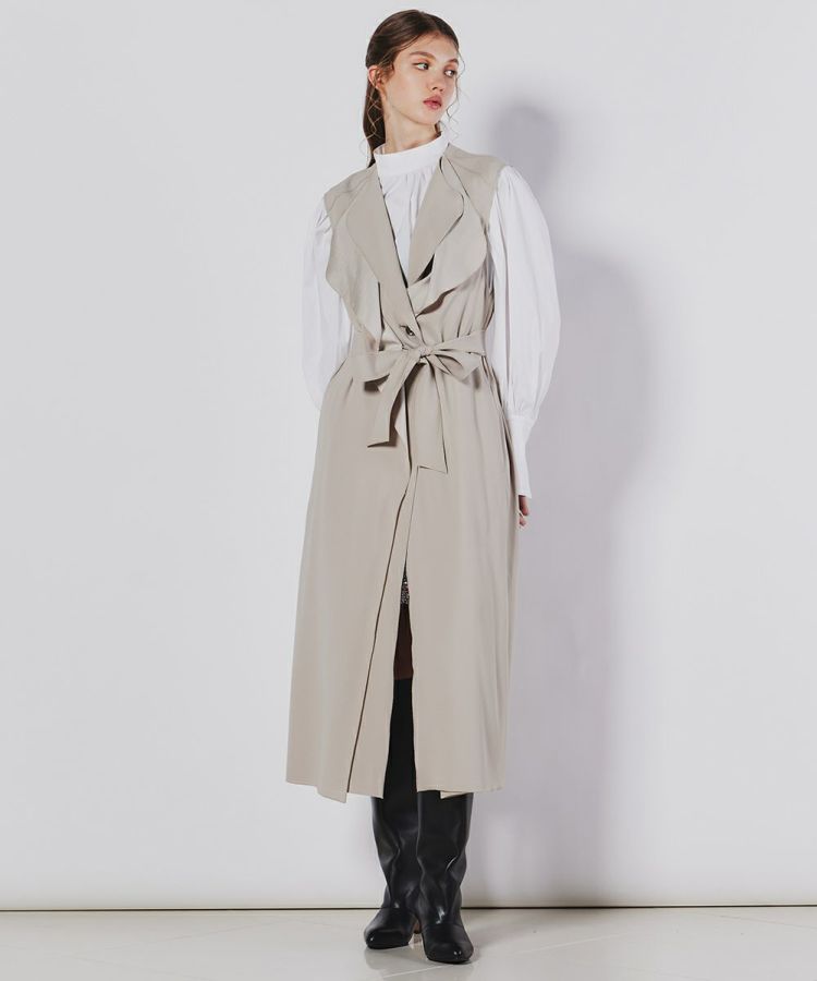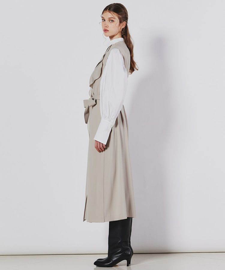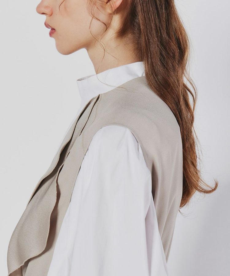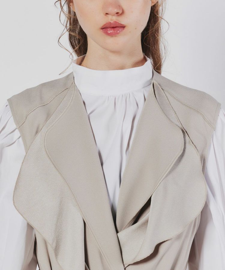 Sov.定番のバックサテン梨地を使用したロング丈のジレ。シャツやカットソー、タートルネックニットなどに羽織るだけでコーディネートを格上げできるレイヤードアイテムです。また、フリルのディテールが上品でフェミニンな印象をプラス。適度なストレッチ性と落ちすぎないドレープ感のある生地で、程良いふくらみがあり、しっかりと仕立て映えする一着です。