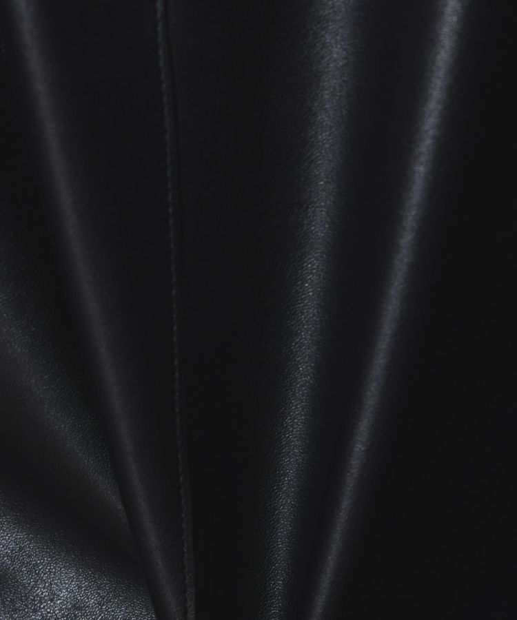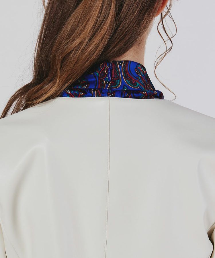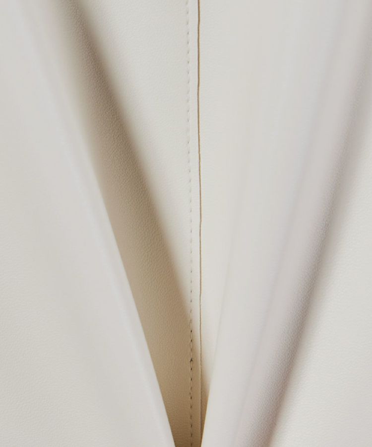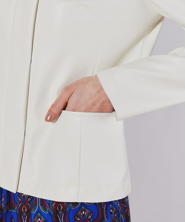 ハードになりすぎず、フェミニンに着こなせるノーカラータイプのフェイクレザージャケット。カジュアルなパンツにも、上品なワンピースにも合わせられるのが魅力です。また、本革よりもぐんと軽やかなのもうれしいポイント。一着備えておくと、季節の変わり目の羽織として重宝するアイテムです。