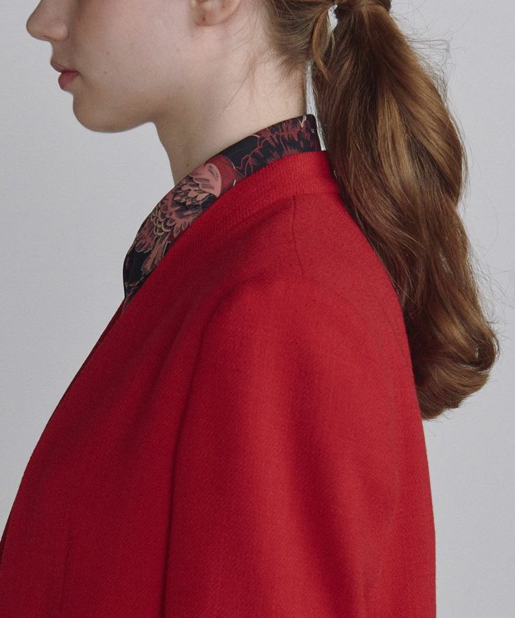 ポリエステルでありながらウールのような膨らみと程よいハリ感のあるジャケット。ノーカラー仕様のすっきりとしたショート丈で、カーディガンのように気軽に羽織れるのが魅力です。品のあるなめらかな質感とドレープ感に加え、カジュアルなコーディネートにも合わせられる独特の表面感もポイント。暗くなりがちな秋冬のコーディネートの差し色にぴったりで、シャツとの相性も抜群です。