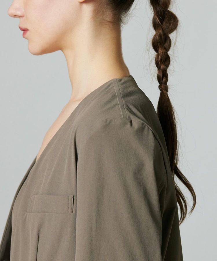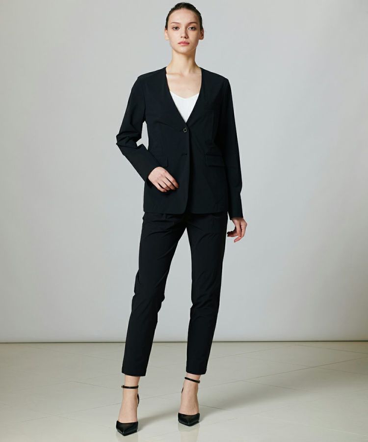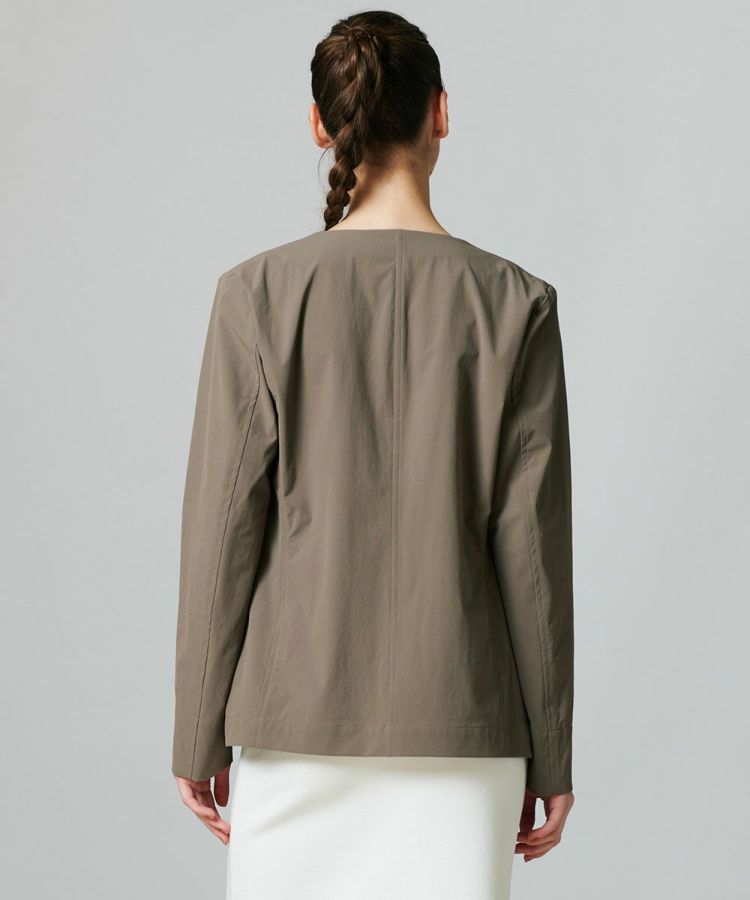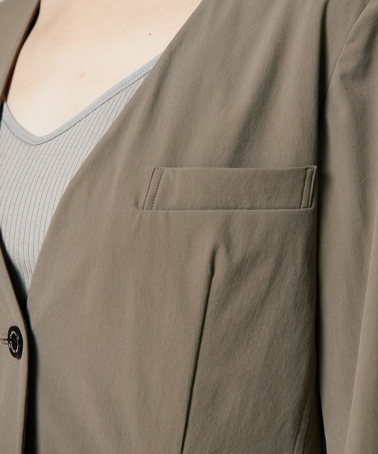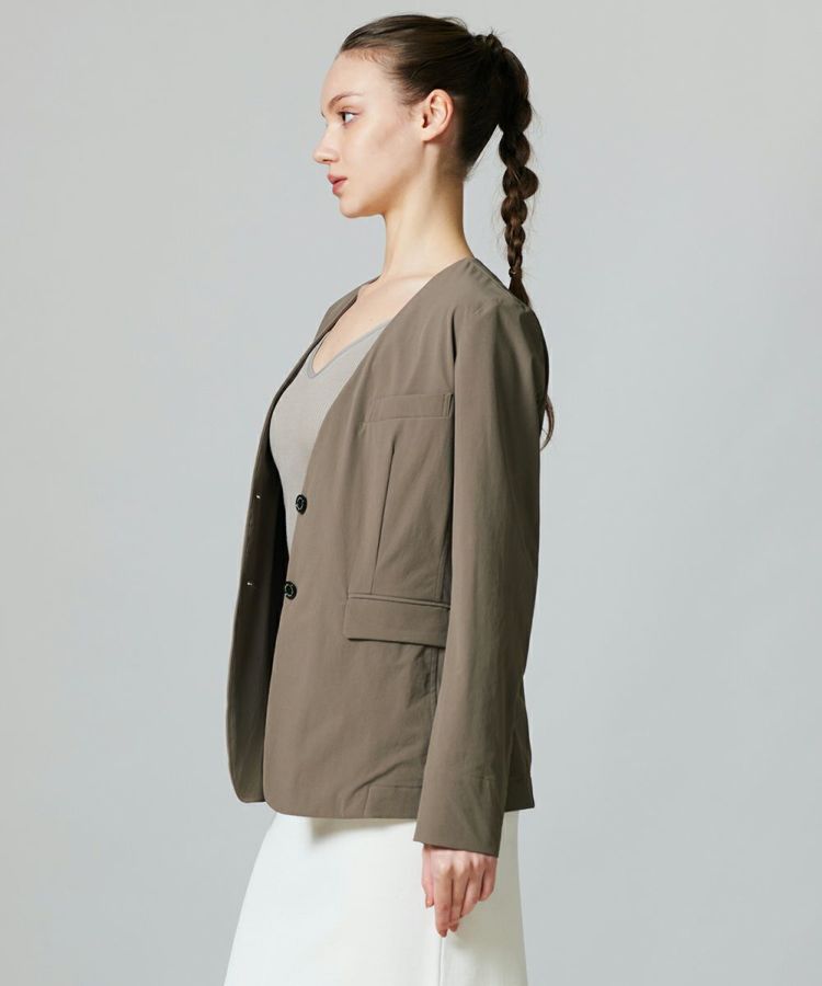 Tシャツに合わせるだけで、こなれた印象を作ってくれるノーカラータイプのジャケット。きちんと感を演出してくれる程よいハリのある素材ながらも、ストレッチ性のある生地で、動きやすさ抜群です。ボウタイブラウスとも相性が良く、オンオフ問わず活躍する一着。合わせやすいカラーリングで、ひとつ持っておくとコーディネートの幅が広がるアイテムです。