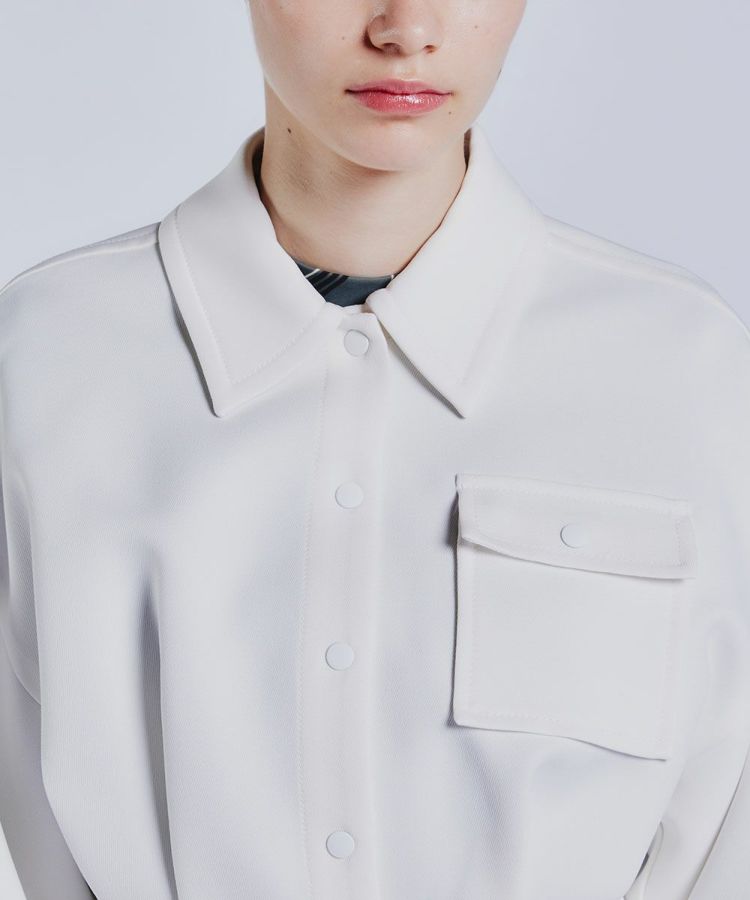 コーディネートにプラスするだけでスタイルアップ効果が狙える、ショート丈のシャツアウター。まるでボンディングしたようなふくらみ感が、一枚の生地で表現されています。アセテートとポリエステルの交織により、ハリ感をだしながらもソフトなふくらみ感と高級感を実現。ショート丈と立体感がスタイルにモードなエッジをプラスしてくれること間違いなしです。ミニマムなデザインで、着まわし力も抜群!