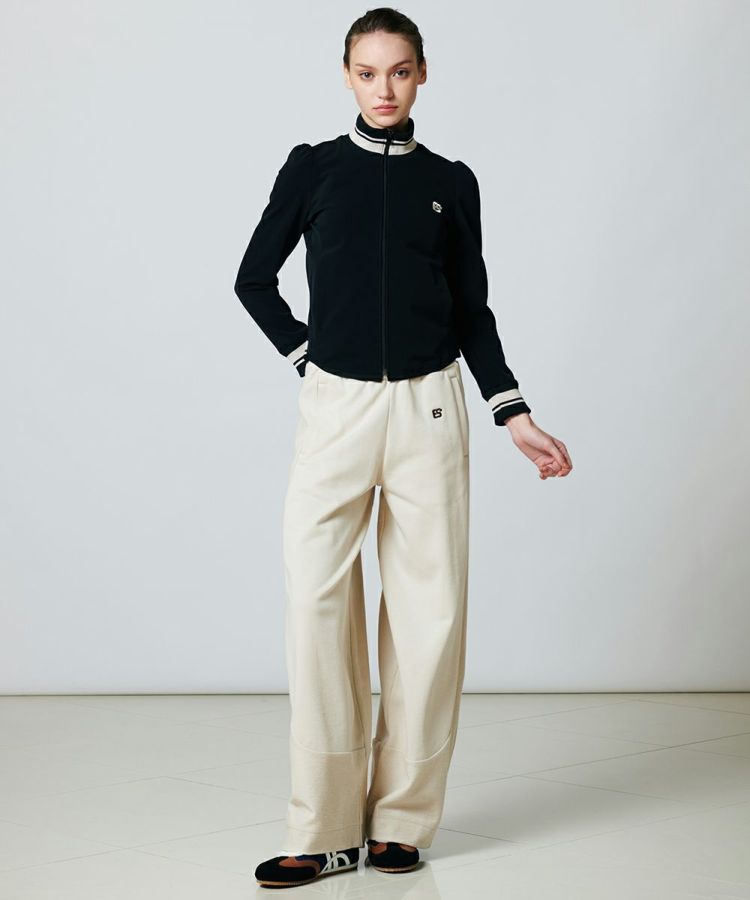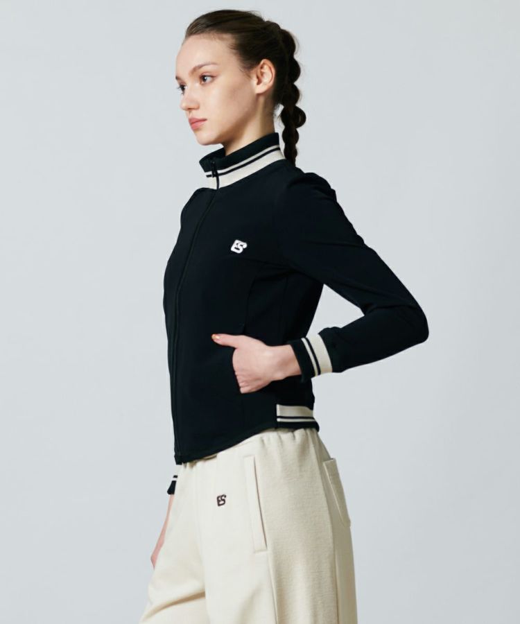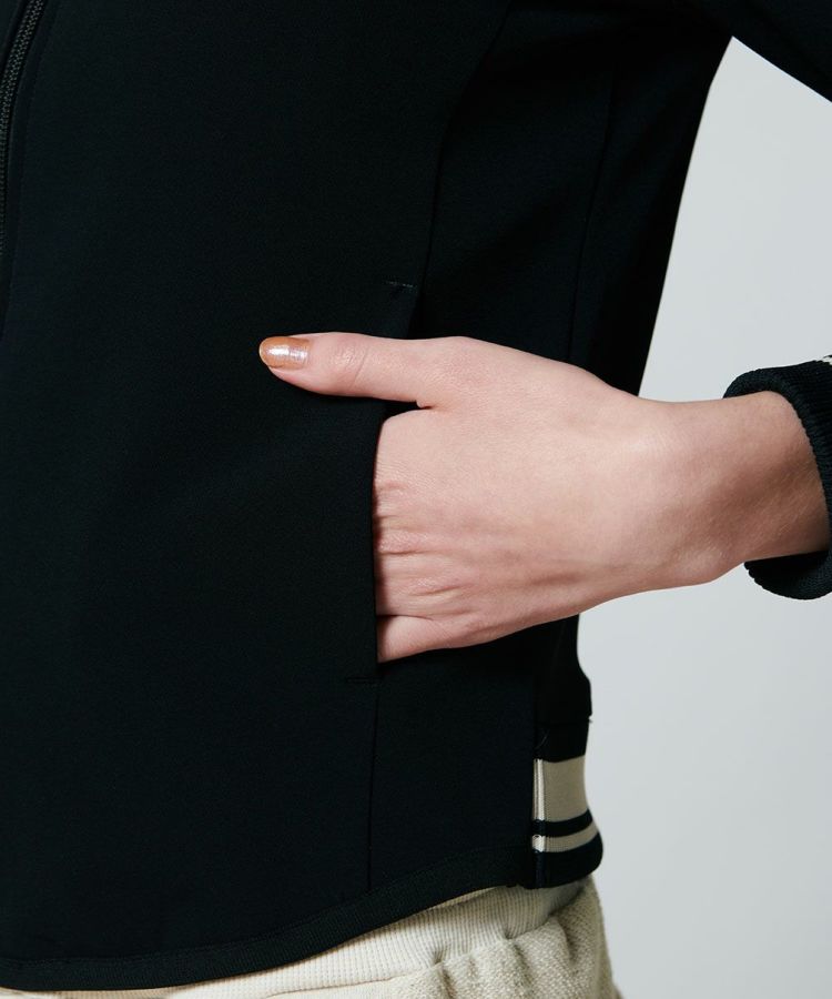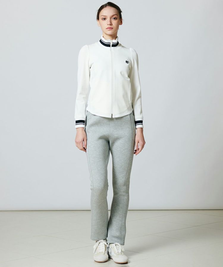 ストレッチ性に優れたジャジーライクな素材を使用したジャケット。キックバック性に優れ、動きやすくシワになりにくいため、スポーティーでありながらきれいめに着用できるのが魅力です。コンパクトなシルエットに、ギャザーを効かせたショルダーがほんのりと甘いアクセントに。後ろ裾のみ編み立てのリブで、前後の変化を楽しめるデザインになっています。同素材のスコート(型番:2506200243)とセットアップでゴルフウエアとして楽しむのもおすすめ!
