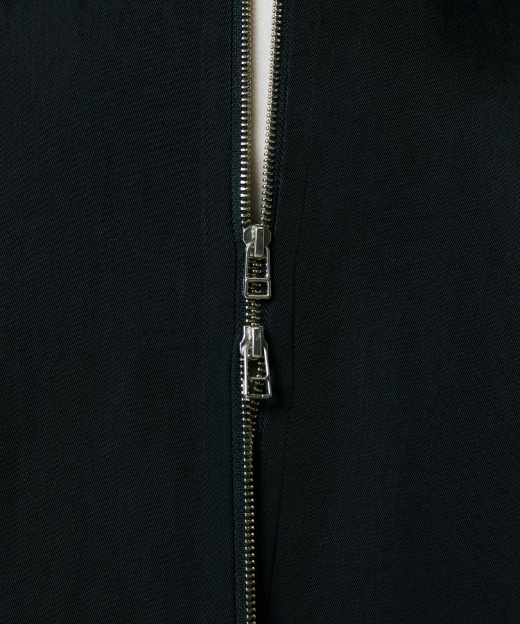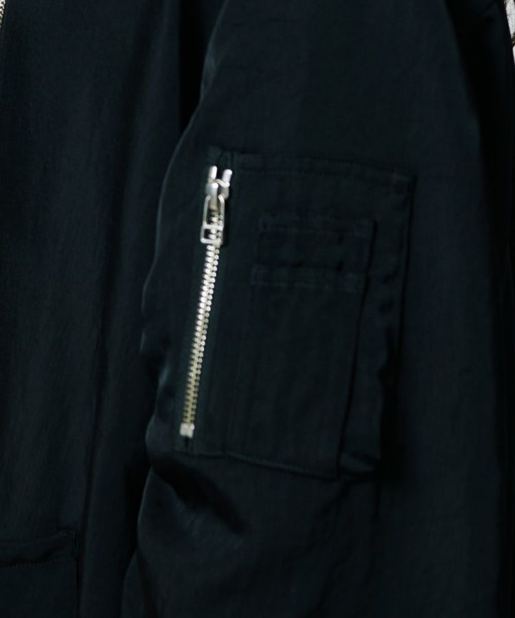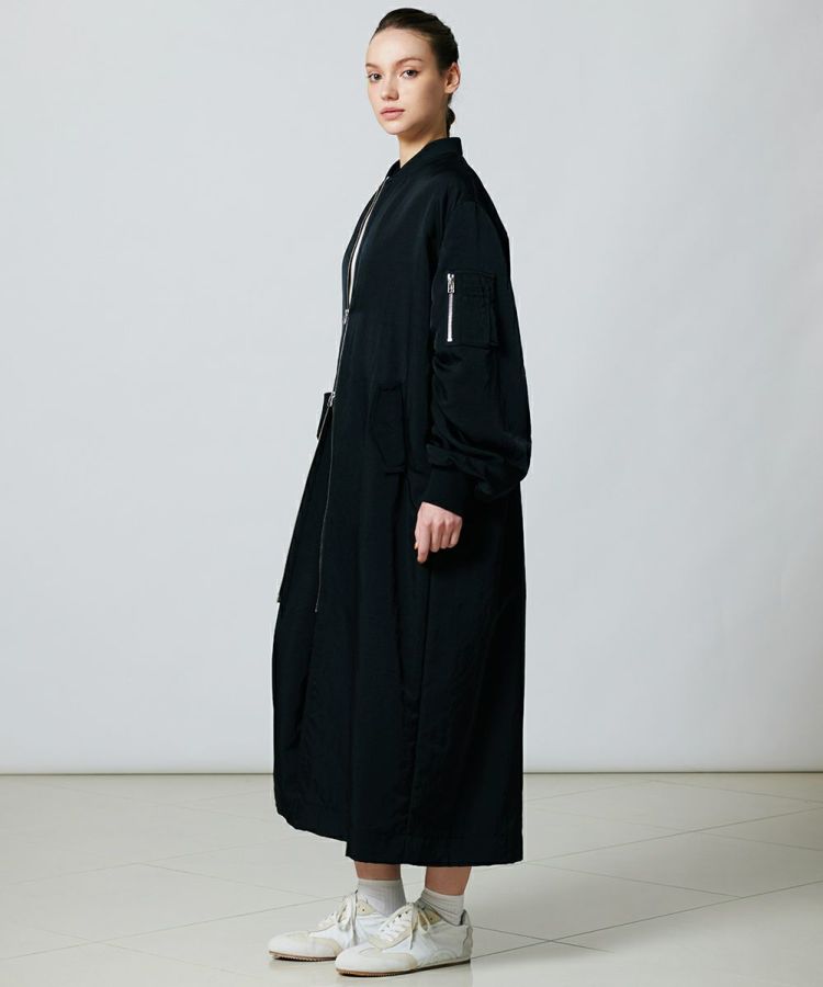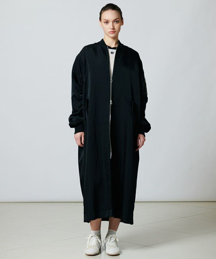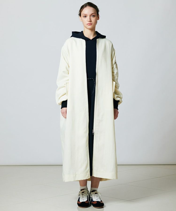 MA-1のディテールを取り入れたロング丈のコート。味わいのあるランダムなシワ加工を施すことで、ヴィンテージライクな風合いに仕上げました。太番手のナイロン糸を使用した重厚感のある素材ながらも、裏地を無くし、軽やかに。サイドのジップがアクセントになっています。撥水機能付なのもうれしいポイント!