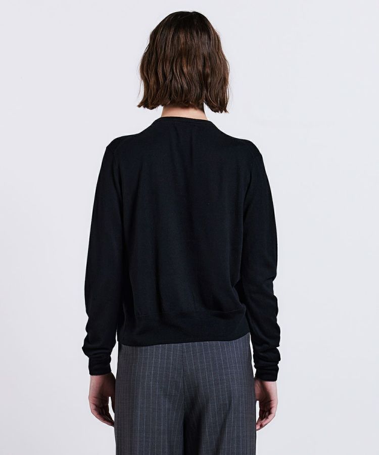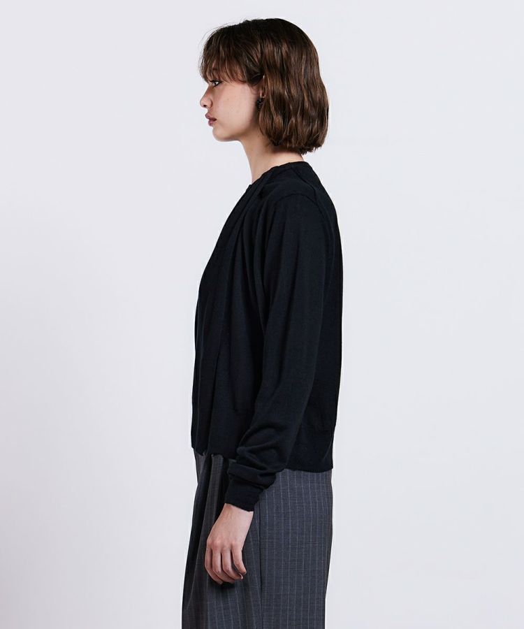 オールシーズン着られるシルクカシミヤの梳毛を使用した、ラグジュアリーな素材感が特長のカーディガン。カーディガンとしてはもちろん、袖を抜いてボレロのように羽織ることもできます。ベーシックな黒は使い勝手良く、挿し色のパープルも、コーディネートの上品なアクセントに。着まわしがききオールシーズン重宝するので、ぜひこの冬からワードロープにプラスしたいアイテムです。