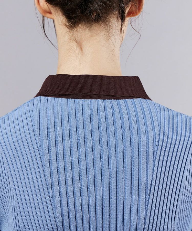 サックスブルーとダークブラウンのバイカラーが目を引く、レトロな雰囲気の長袖ポロニット。ドライな手ざわりで、さらりと快適な着心地を叶えました。縦のラインを強調するデザインで、すっきりとした印象に。タイトなシルエットはフレアスカートなど、ボリュームのあるボトムスとも好相性で、バランスの良い着こなしが楽しめます。