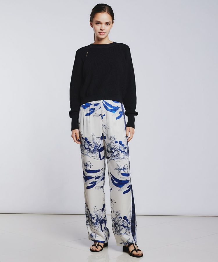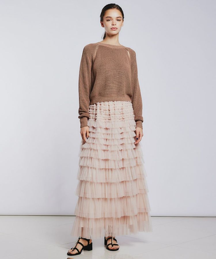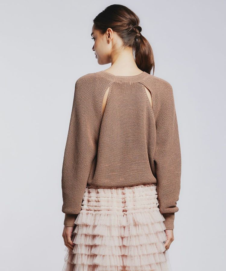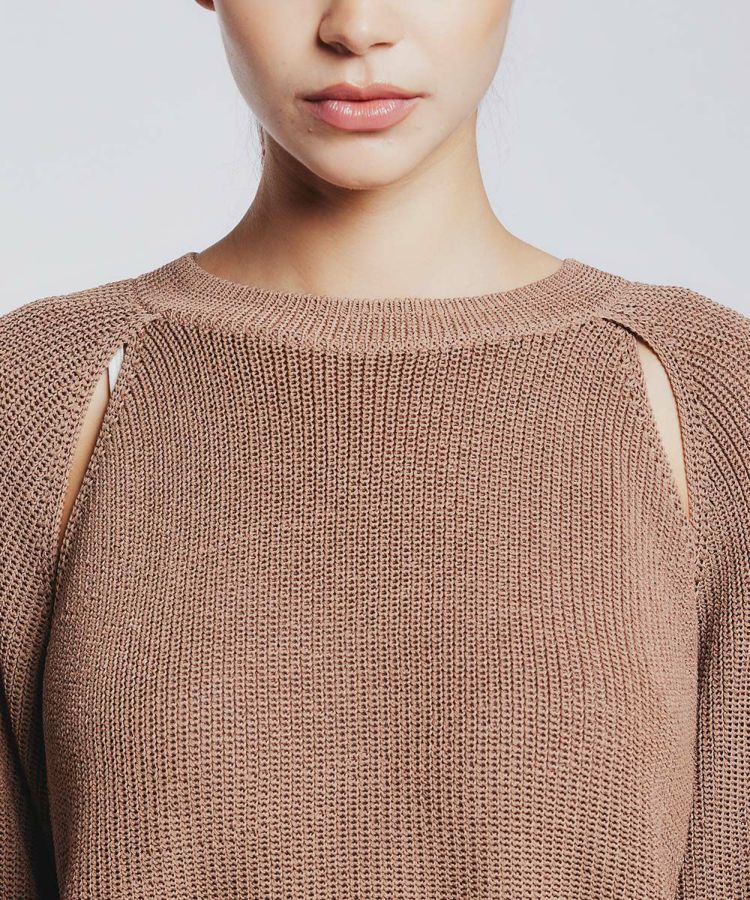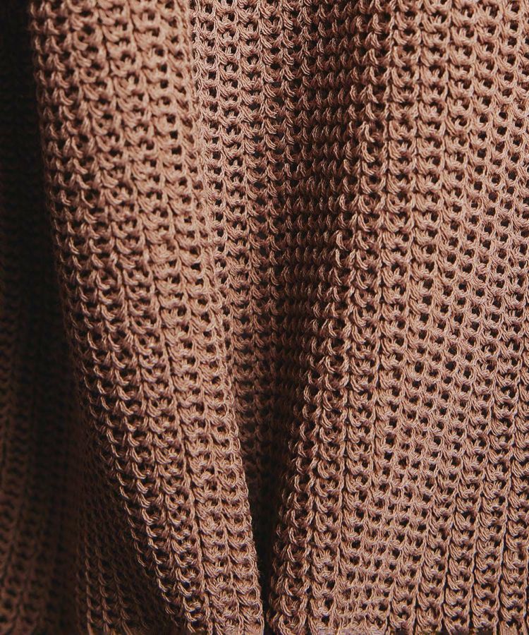 さらりとした14ゲージの方片畦編みをベースにしたニットトップス。一見ベーシックなニットトップスですが、前後のラグラン部分のリンキングを外し、カットラインをアクセントにしています。さりげない肌見せが叶うため、コーディネートしたときに大人っぽい抜け感が出るのが魅力。ショート丈なのでコーディネートのバランスを取りやすく、ハイウエストなアイテムとも相性抜群です。