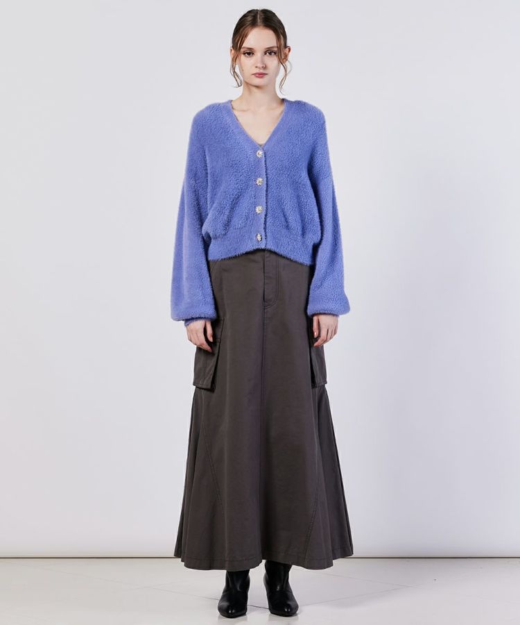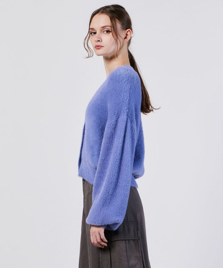 毛足の長いシャギーモールでつくったカーディガン。ふわふわのルックスが見た目にも暖かく、柔らかな表情を演出してくれます。ポイントはシルエットで、ショート丈に加え、スリーブはたっぷりボリュームを持たせることでコーディネートにメリハリを出し、スタイル良く見せてくれるのが魅力。程よいVネックの開き感が女性らしく、上半身の華奢見えを叶えます。ワンピースにも、タイトなパンツとも相性の良い一枚。