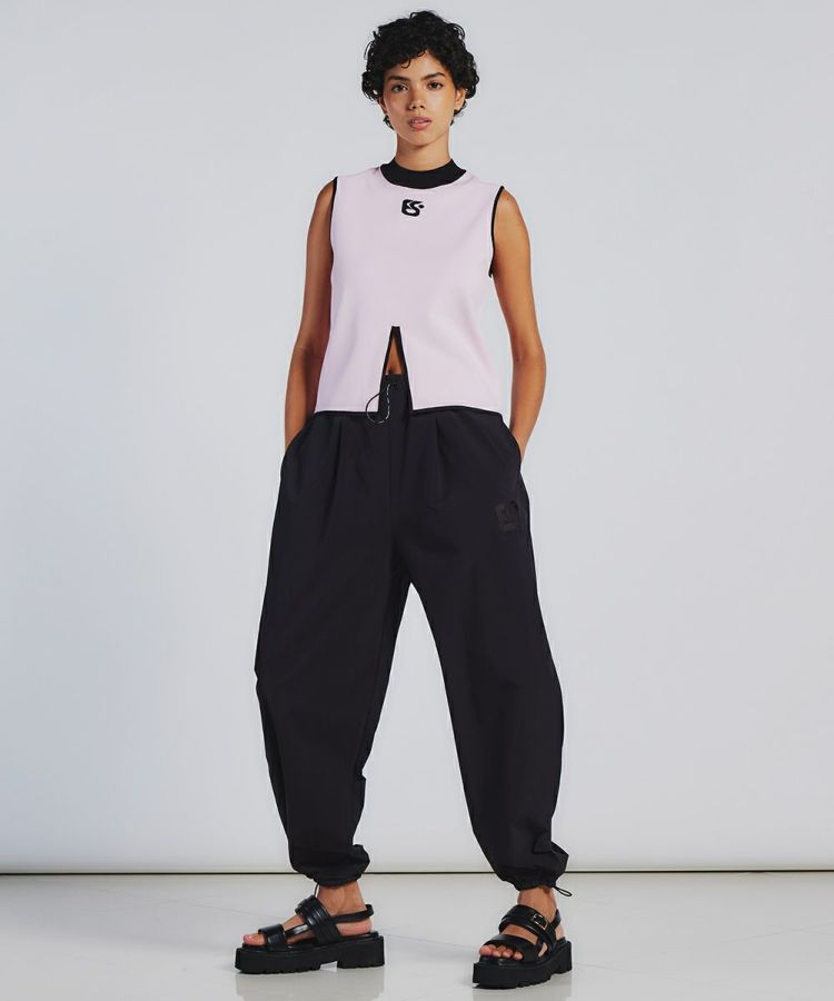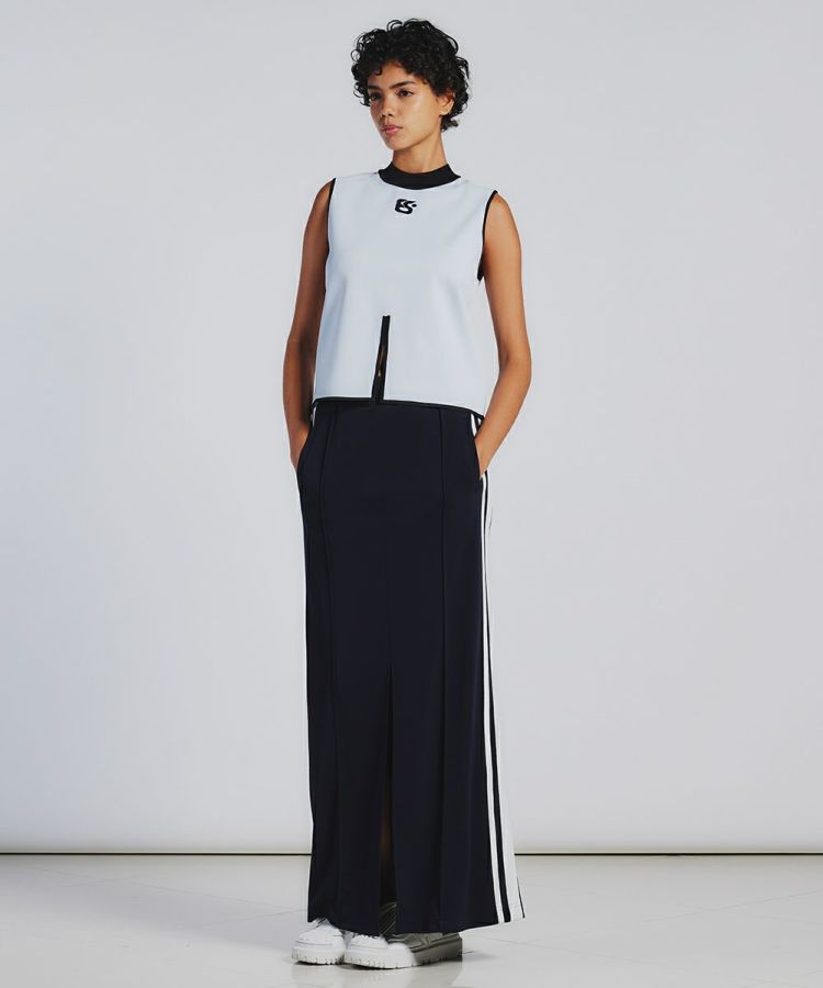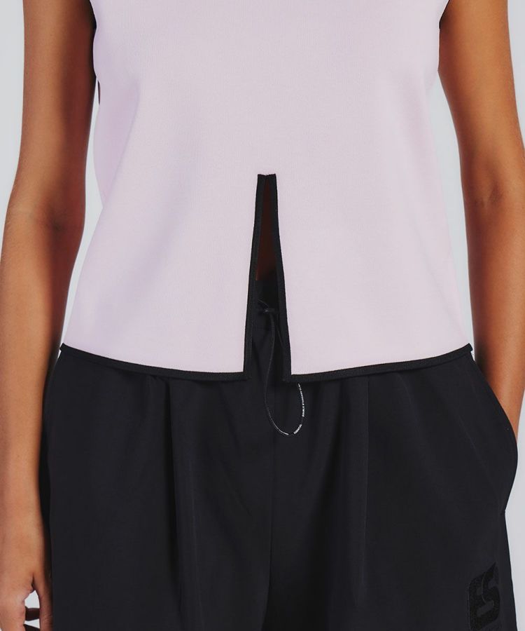 さらりとした清涼感のある質感がスポーティーな印象を与えるノースリーブトップス。胸元のロゴ刺繍や、センターに入ったスリットデザインが効いており、コーディネートのアクセントになります。襟や袖、裾はブラックカラーのリブになっており、淡いカラーリングでも引き締まった印象で着られるのが魅力です。ブラックのボトムと相性抜群。