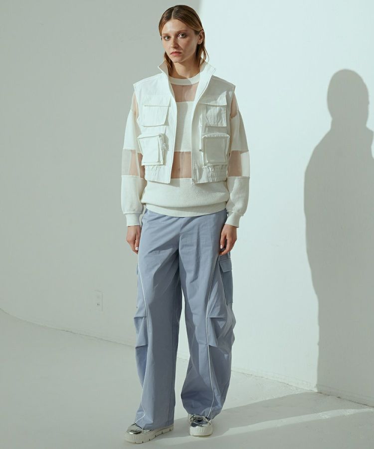 ボーダーになったニット生地と、上品な透け感がのオーガンジー生地がドッキングしたプルオーバー。これ一枚で春夏のレイヤードスタイルが叶う優れものです。カジュアルでありながらセンシュアルなムードがあり、インナーやボトム次第でいろんな肌見せを楽しめます。二の腕を自然にカバーしてくれるのもうれしいポイント。
