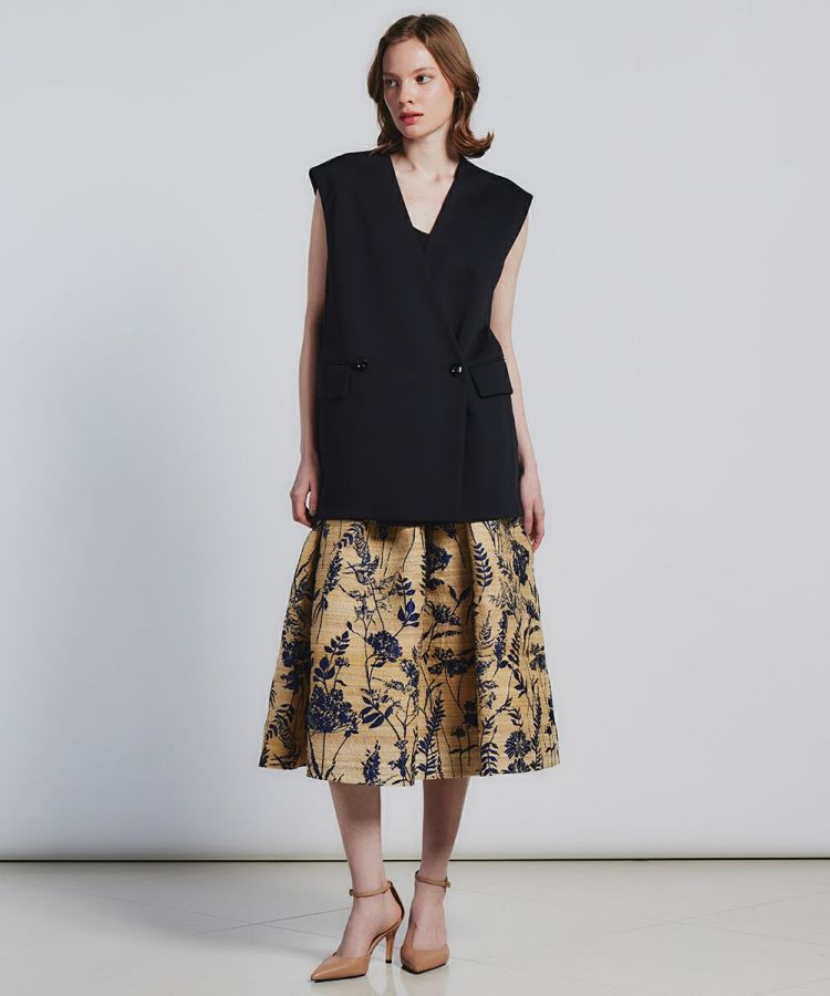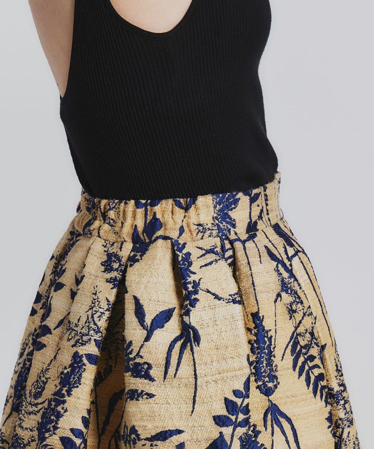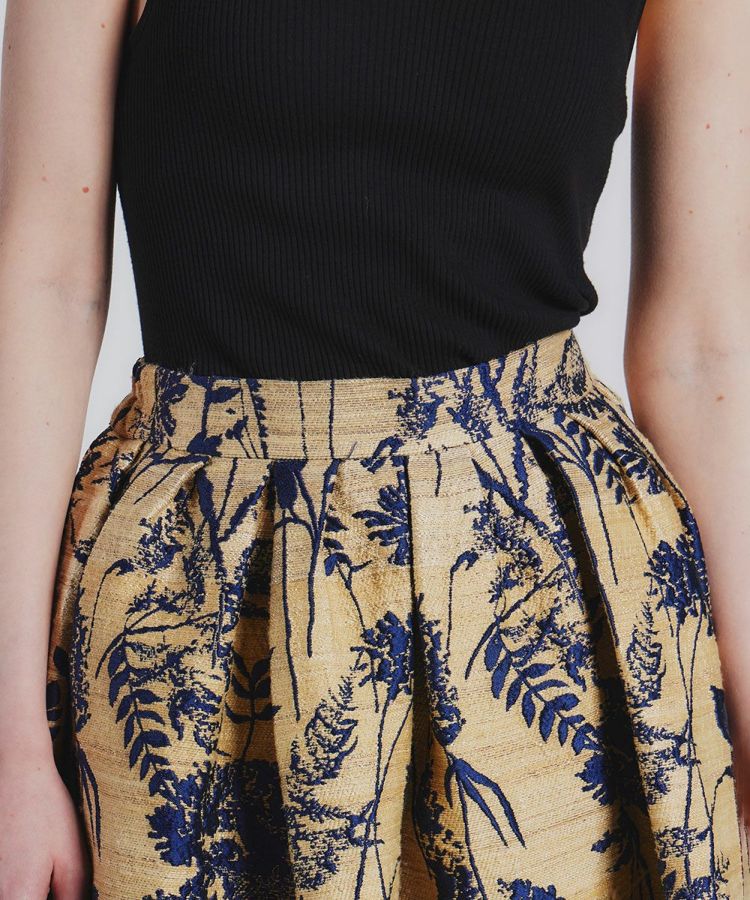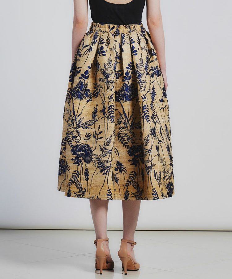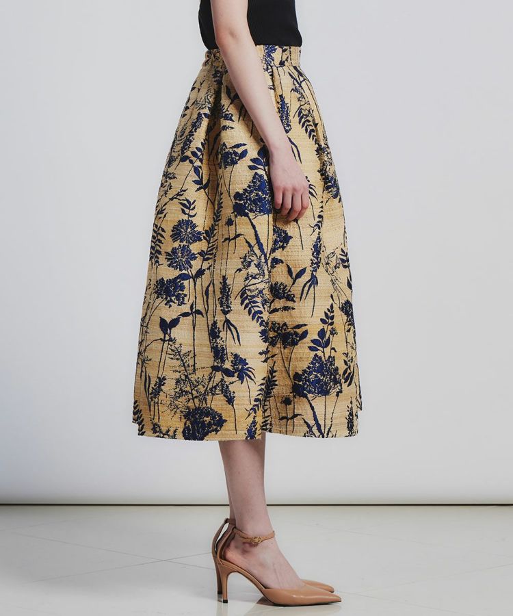 レトロモダンな草花模様のジャガードがラグジュアリーな印象を与えるスカート。立体感とハリ感のあるAラインシルエットがコーディネート映えする一着です。イタリアのコモ地区で1989年に創業した老舗生地メーカーの生地を使用。インパクトがありながらもシックで大人っぽく着られる、絶妙なカラーリングと質感が魅力です。ドレープが効いているため、ウエストやヒップラインがカバーされるのもうれしいポイント。