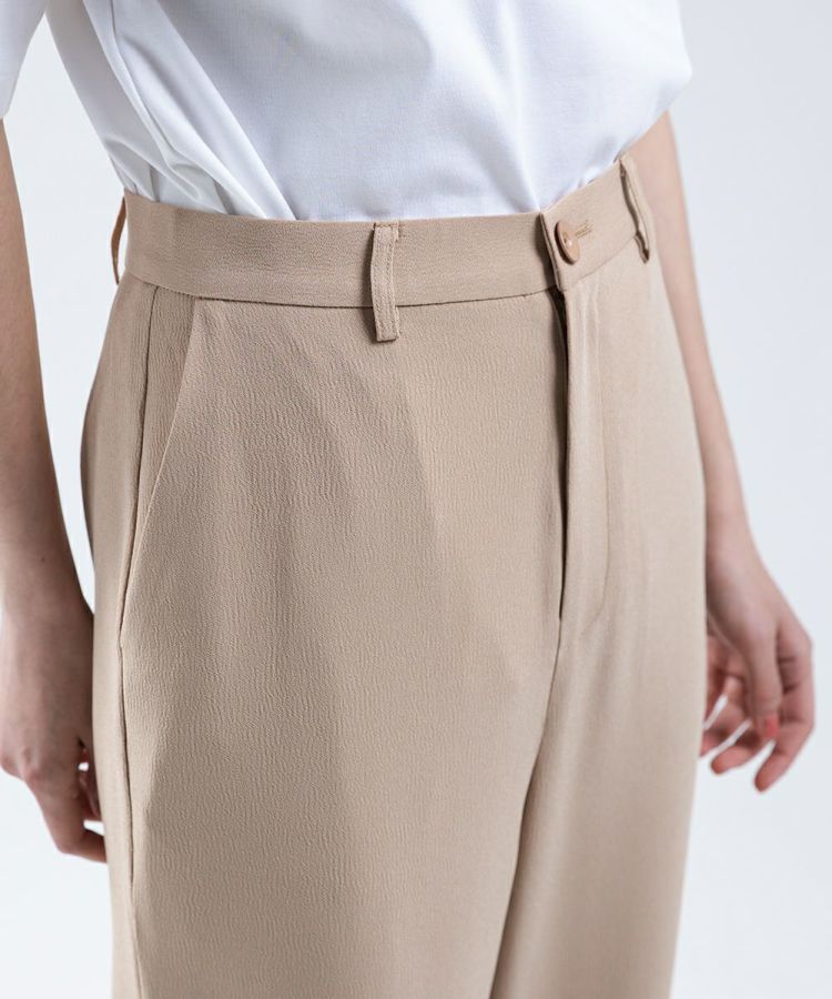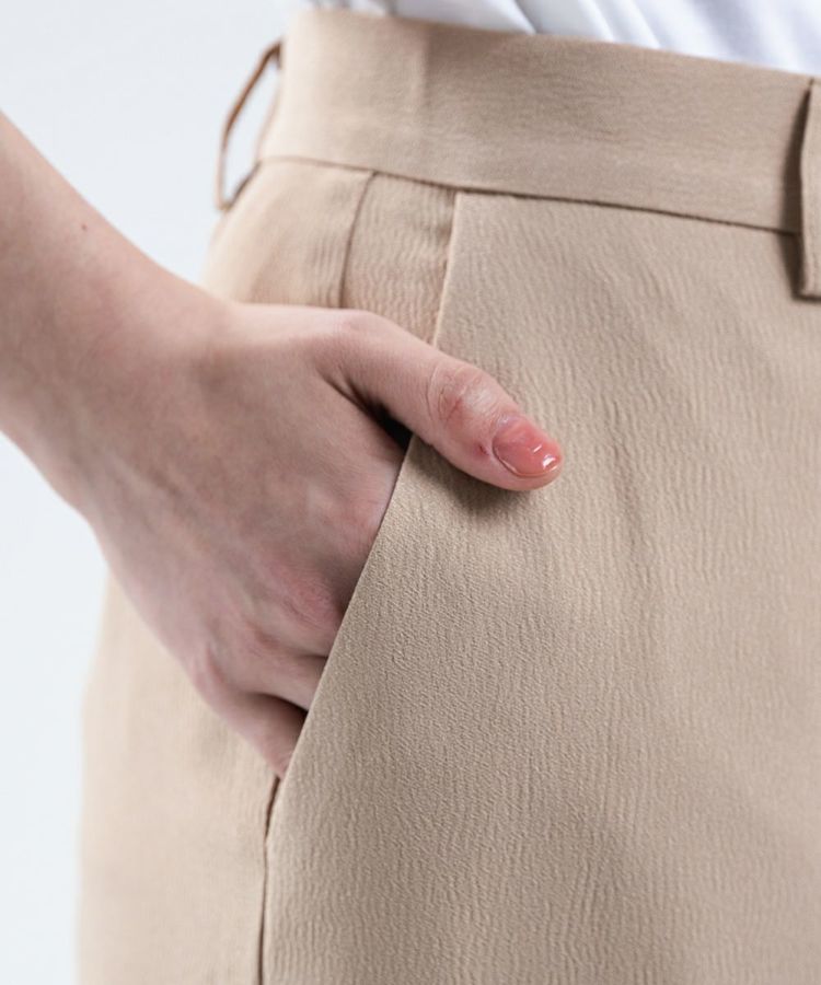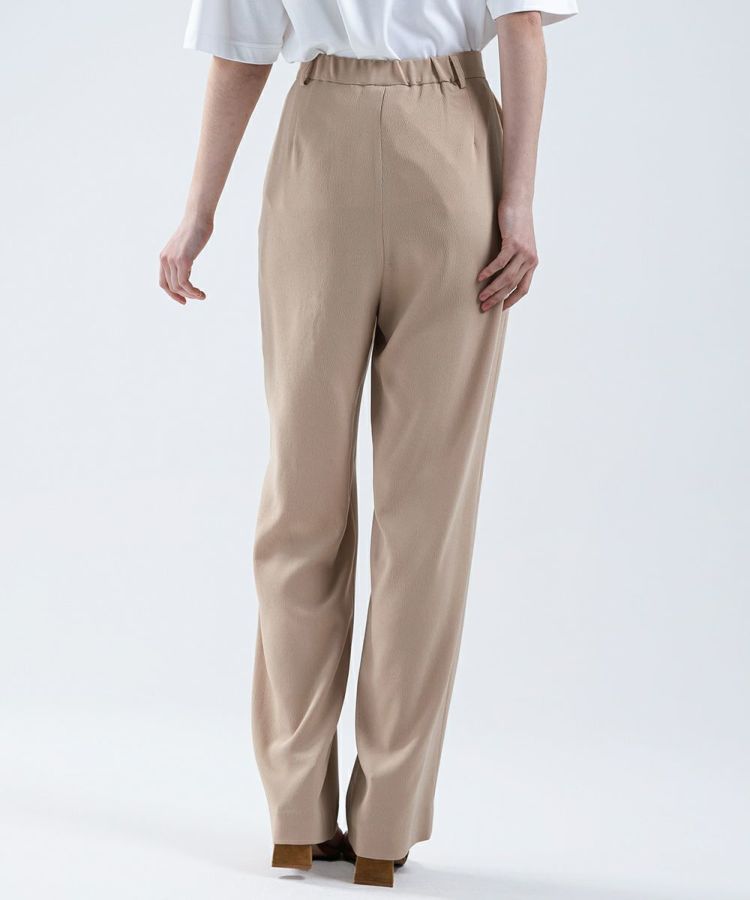 涼しげな肌触りが心地よい、バックサテンのジョーゼットパンツ。すらっとしたストレートシルエットがスタイリッシュな佇まいを叶えます。テロンとした落ち感があるのもポイントで、動くたびにシルエット変化が出て美しく、柔らかな印象をもたらします。ワークスタイルにも、普段着にもぴったりな一本。同素材のジャケットと合わせると、こなれ感のあるセットアップコーデが実現します。