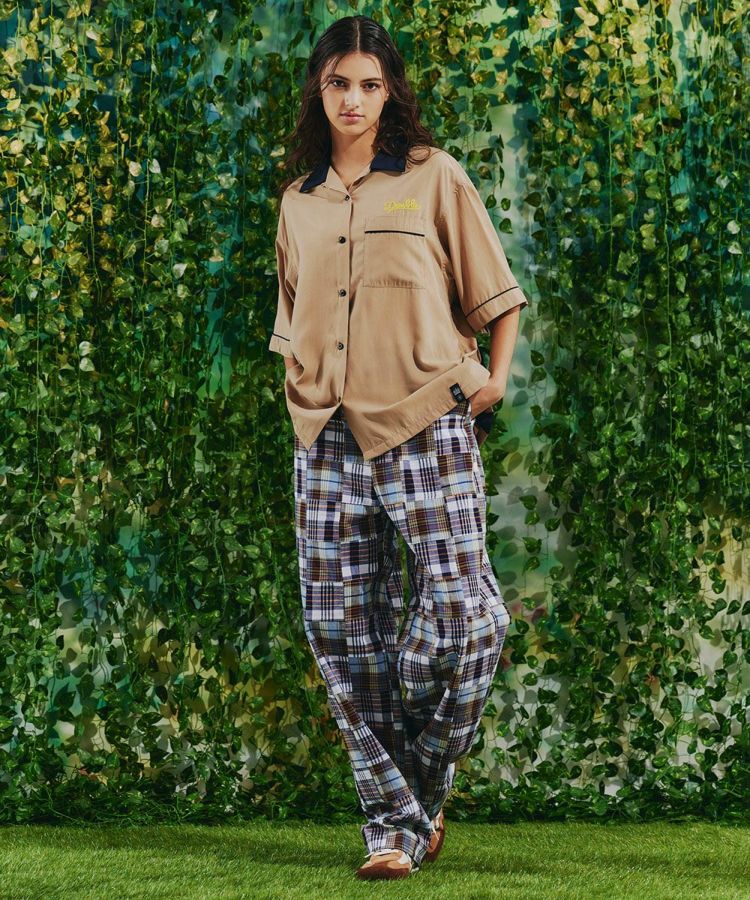 マドラスチェック柄をパッチワークにした、インパクトのあるパンツ。Tシャツに合わせるだけでコーデがサマになる程よいワイドシルエットで、着まわし力も抜群です。ウエストはボタンできちんと感がありながらも、バックはゴム仕様なので穿き心地楽チン。腰まわりやヒップラインをさりげなくカバーしてくれるのもうれしいポイントです。