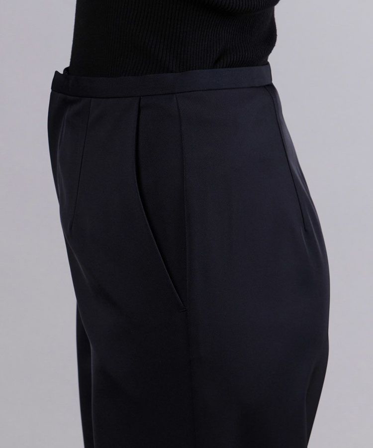 ナチュラルなストレッチ性とソフトな風合いを兼ね備えたストレートパンツ。タック入りのシンプルなデザインは、トップスを選ばず幅広いシーンで活躍します。奥行きのあるダークネイビーのカラーが、落ち着きのある大人の女性を演出。同素材のシャツ(型番:0304260253)と合わせれば、シックなセットアップスタイルも楽しめます。