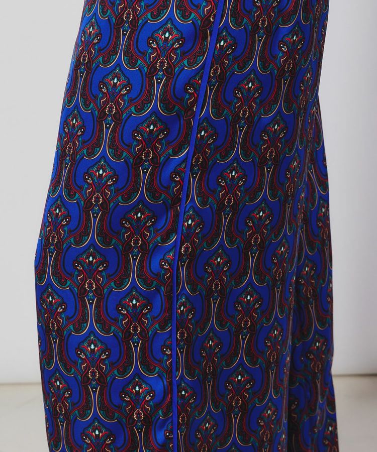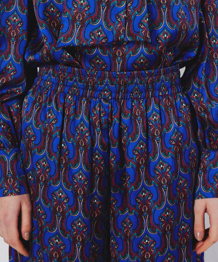 柔らかなポリエステルサテン生地を使用したパンツ。ペイズリー柄をプリントし、華やかに仕上げました。ボディラインを拾わず、きれいなシルエットで穿けるのも魅力的。ウエストはゴム仕様になり、穿き心地は楽チンです。同素材(型番:0304500243)とセットアップで着用するのはもちろん、あえてカジュアルなパーカーやニットトップスと合わせるのもおすすめです。