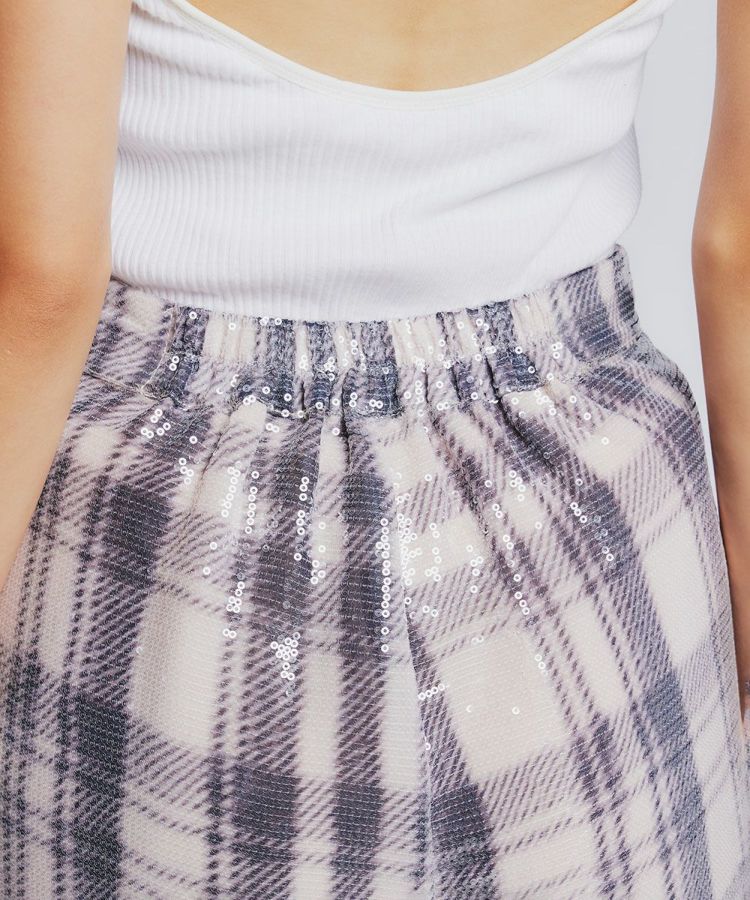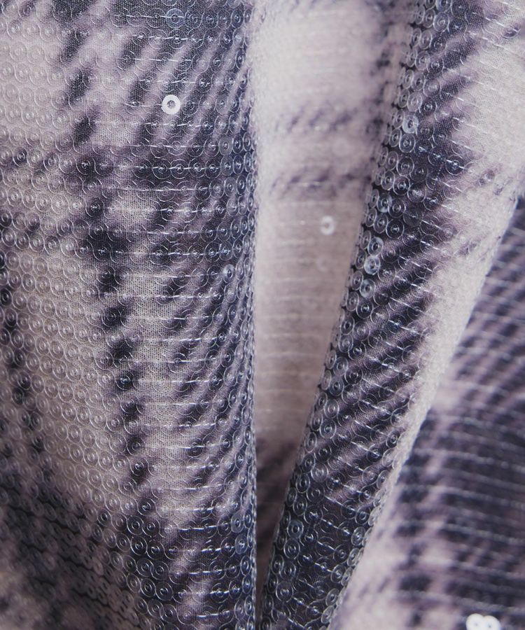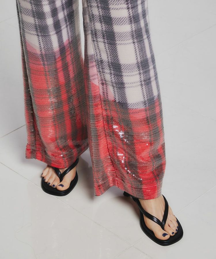 ペイント加工を施したネルシャツのような模様を、全面スパンコールで表現した贅沢なパンツ。ラフなシルエットながらも、スパンコールの輝きが唯一無二の存在感を放ちます。裾に赤いペイント加工風をあしらいアクセントに。同素材のシャツ(型番0304540241)とセットアップで着こなして欲しいアイテムです。