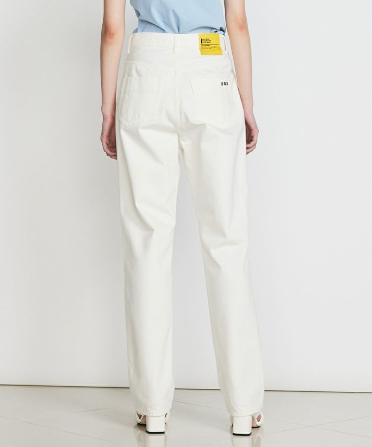 トップスを選ばず活躍する、ゆるやかなテーパードシルエットのデニムパンツ。きれいめに見えるモノトーンカラー展開です。すっきり感がありながらも程よいゆとりがあるため、カジュアルでもきれいめにも合わせられるのが魅力。バックにあしあらったイエローのネームラベルが、コーディネートのアクセントになります。