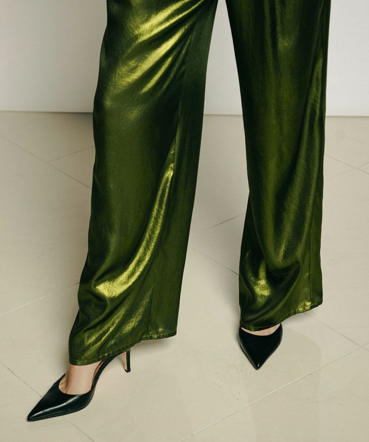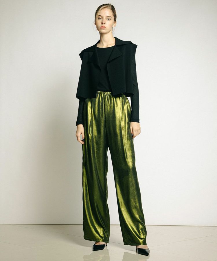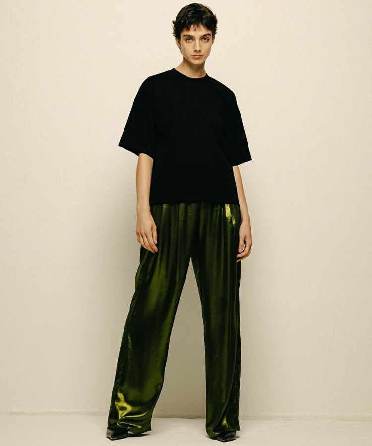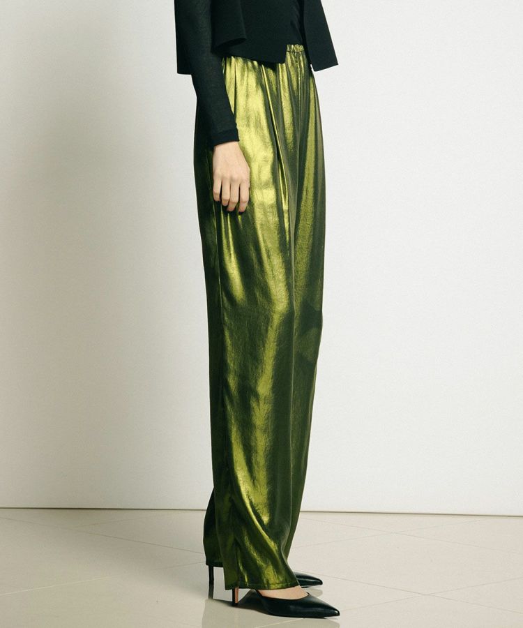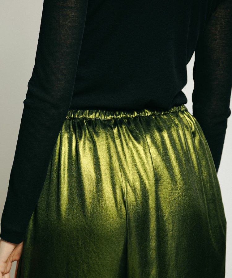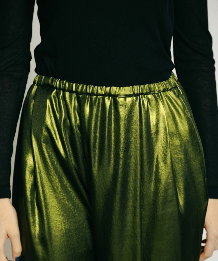 テロンとした落ち感がきれいなポリエステルサテンに、全面箔プリントを施した華やかなパンツ。ハーフトーンで施しているため、陰影のあるシャイニーな質感が実現しました。ゆったりとした穿き心地で、リラクシンながらもしっかりとドレスアップできるのが魅力的。キャミソールやタンクトップを合わせると夏のスタイルが煌びやかに変わり、ジャケットを合わせてこなれ感を出すのもおすすめです。