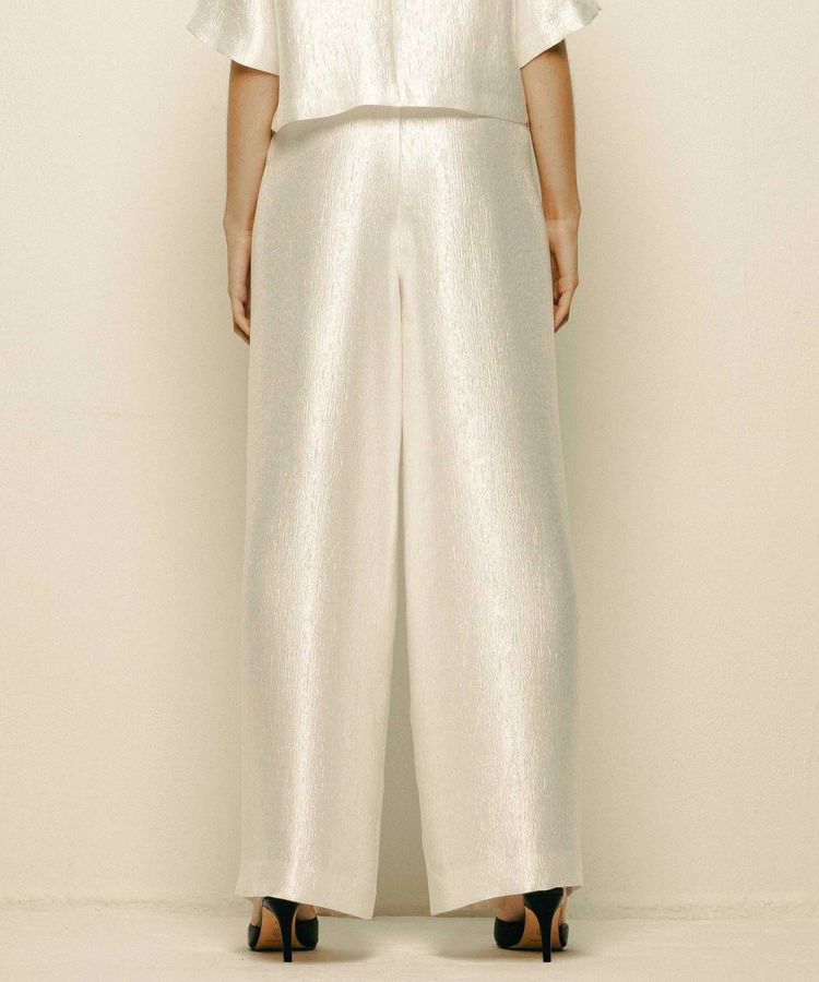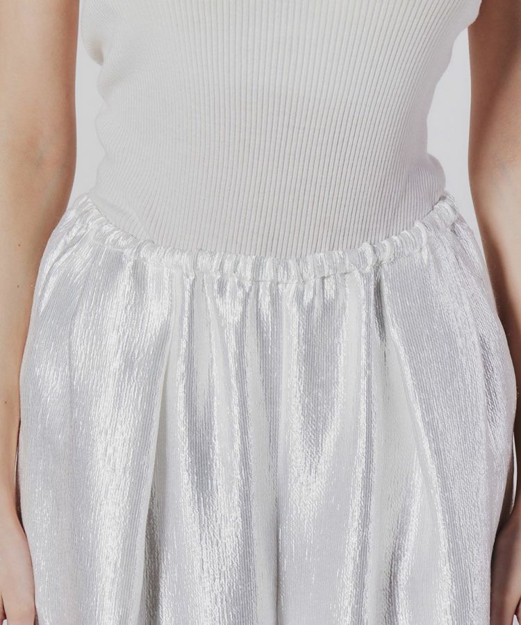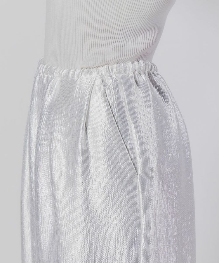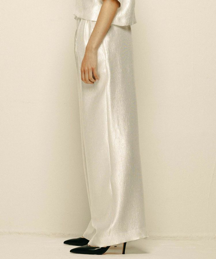 ブライト糸を使用した光沢感の美しいパンツ。すとんと落ちるワイドなシルエットは、横から見てもとてもきれいです。ドビー組織という手法を取り、経糸に細い糸を、緯糸に太い糸を使用することであえてアンバランスな表面にし、表情のある質感に仕上げました。シンプルなデザインでも品良く着映えのする一枚。同素材のトップス(型番4804260241)とセットアップで合わせると洗練された大人のリラックススタイルが実現します。