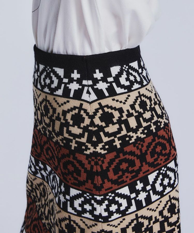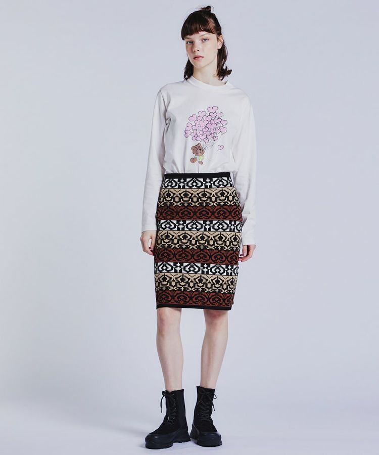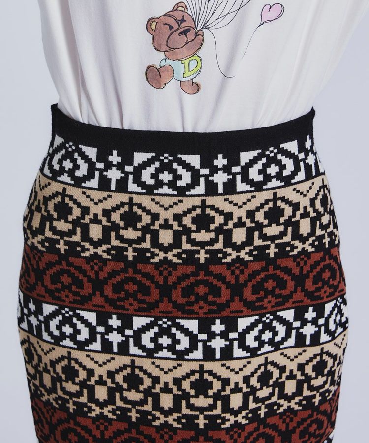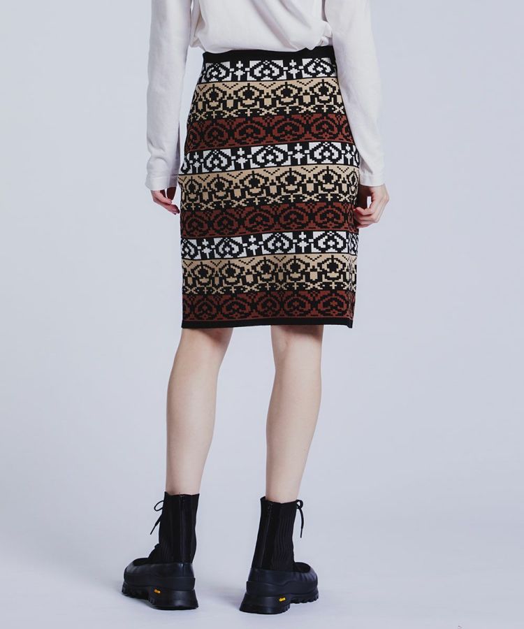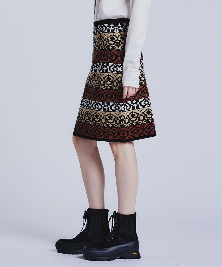 ダブスタ定番のSNOWY糸で編み上げた、ジャガードニットスカート。存在感あるジャガード柄は、シンプルなトップスと合わせるだけでおしゃれにきまります。ウエストや裾には黒無地ラインを配し、メリハリあるシルエットに仕上げました。また、ニット素材ならではの柔らかな穿き心地や、動きやすさも魅力。パンプスで上品に、スニーカーでカジュアルに着こなすのもおすすめです。