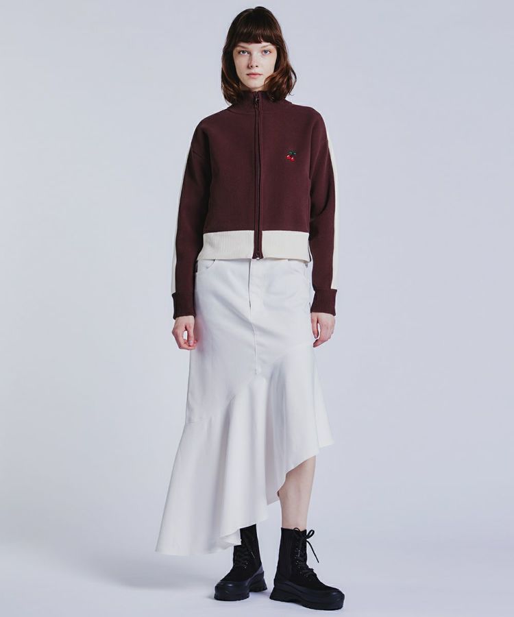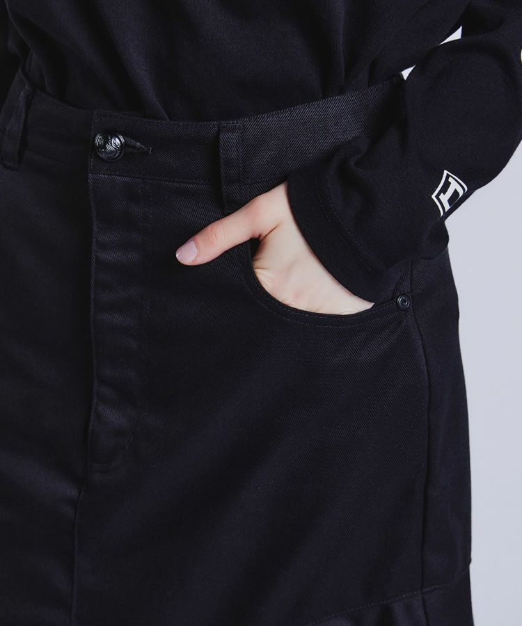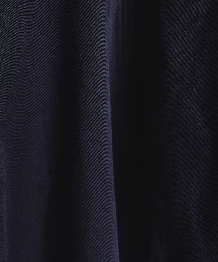アシンメトリーな切り替えが目を惹くフレアスカート。ベーシックなカラーながらも、動きのあるシルエットと左右差のある丈がカジュアルの中に女性らしい印象を与えてくれます。素材は、オーガニックコットンとリサイクルポリエステルをMIXしたサスティナブル原料を使用。程よいハリ感と品のある光沢がポイントです。