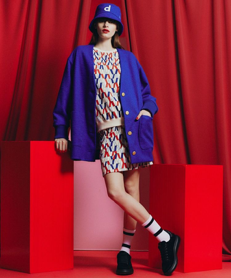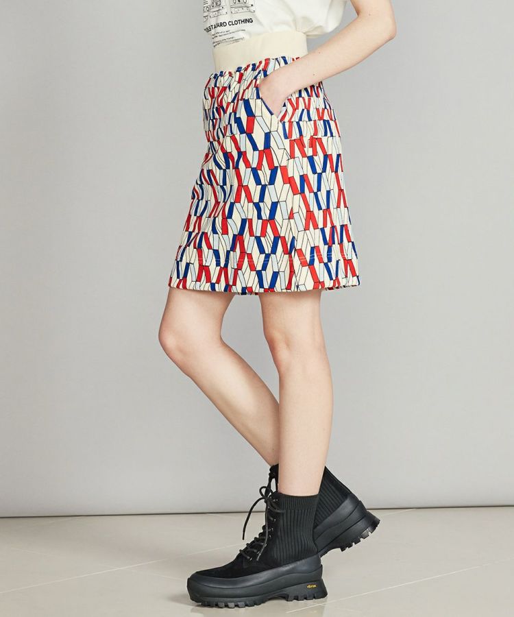 ポップアートのような幾何学模様が目を引くスカート。足がキレイに長く見える絶妙な丈感なので上品さがあり、新定番の大人ミニ丈としてチャレンジしやすいアイテムです。また、総柄でありながらもコンパクトなシルエットなので全身のバランスを取りやすく、着まわしやすいのも魅力。同素材の