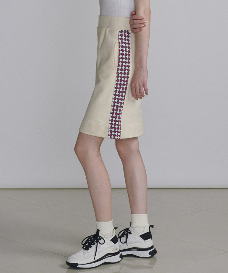 コンパクトなシルエットのミニ丈スカート。グラフィカルなチェーン柄をサイドにあしらいポイントにしています。足がキレイに長く見える絶妙な丈感なので上品さがあり、新定番の大人ミニ丈としてチャレンジしやすいアイテム。ウエストはゴム仕様なので穿き心地は楽チンです。同柄の