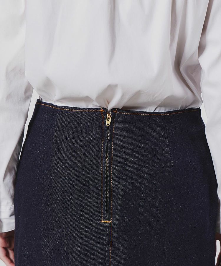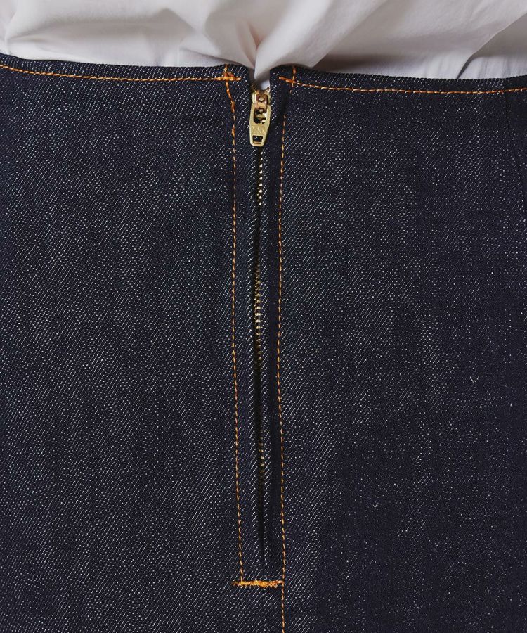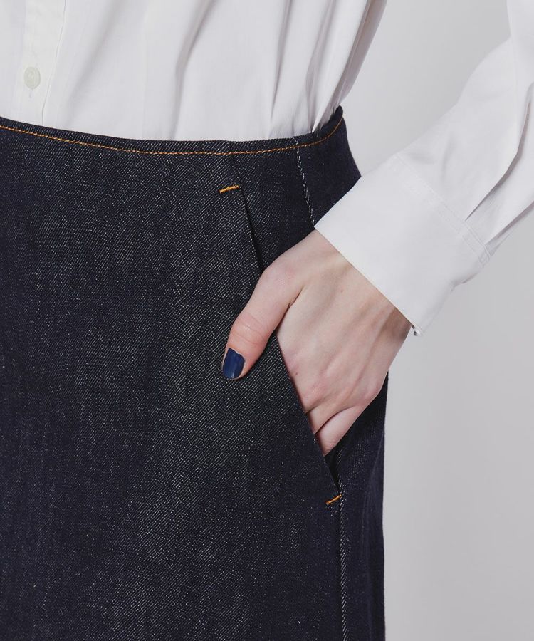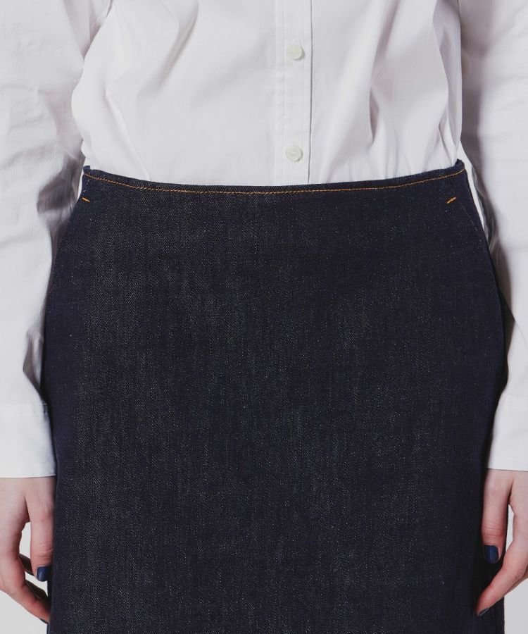 パリッとした生デニムの風合いがポイントになったミニスカート。前からはもちろん、横から見た時もきれいな台形シルエットになっているため、ハンサムな印象ながらも、女性らしい着こなしを叶えてくれます。ウエストは切り替えを作らす、すっきりとしたデザインに。トップスをインしても全身コーデが決まるのも魅力です。