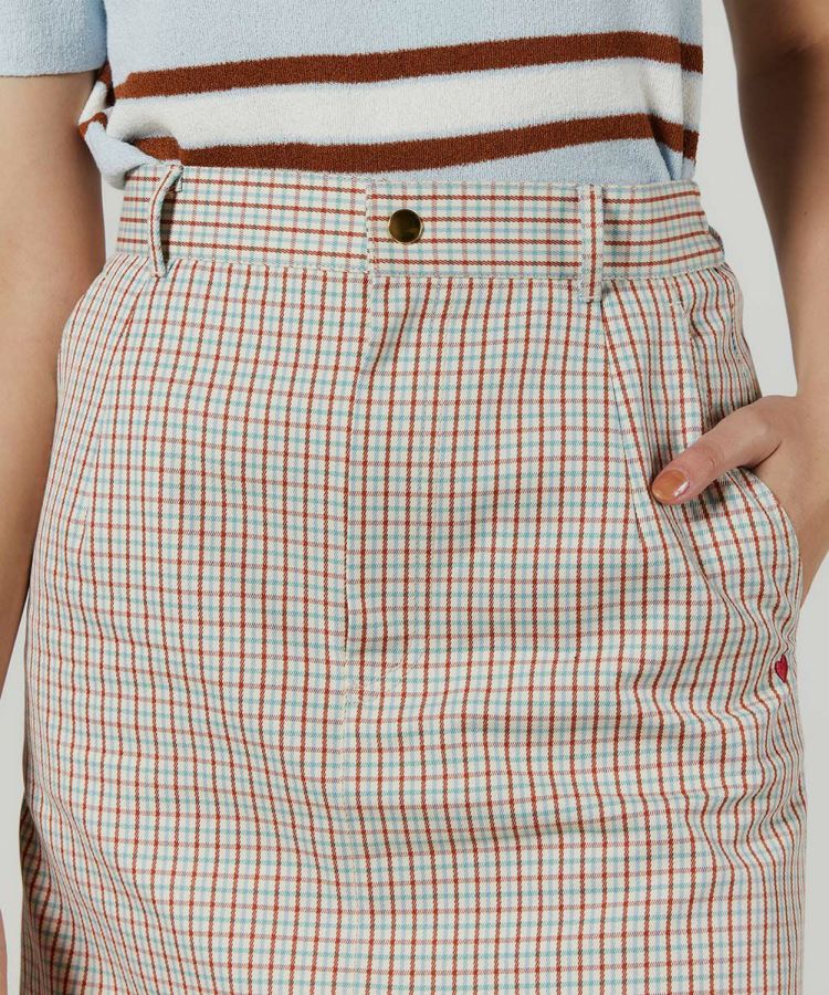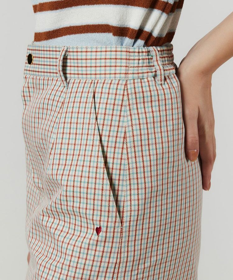 チョコミントのような柔らかなカラーリングがかわいいチェック柄のミニスカート。ウエストを高めに設定することで、脚長効果抜群です。また、バックはゴム仕様なので穿き心地楽チン。後ろポケットや左ポケットのそばにあしらったハートの刺繍など、ディテールも抜かりがありません。ボタンにはゴールドカラーをチョイスし、ポップでありながら高見えするのも密かな魅力。