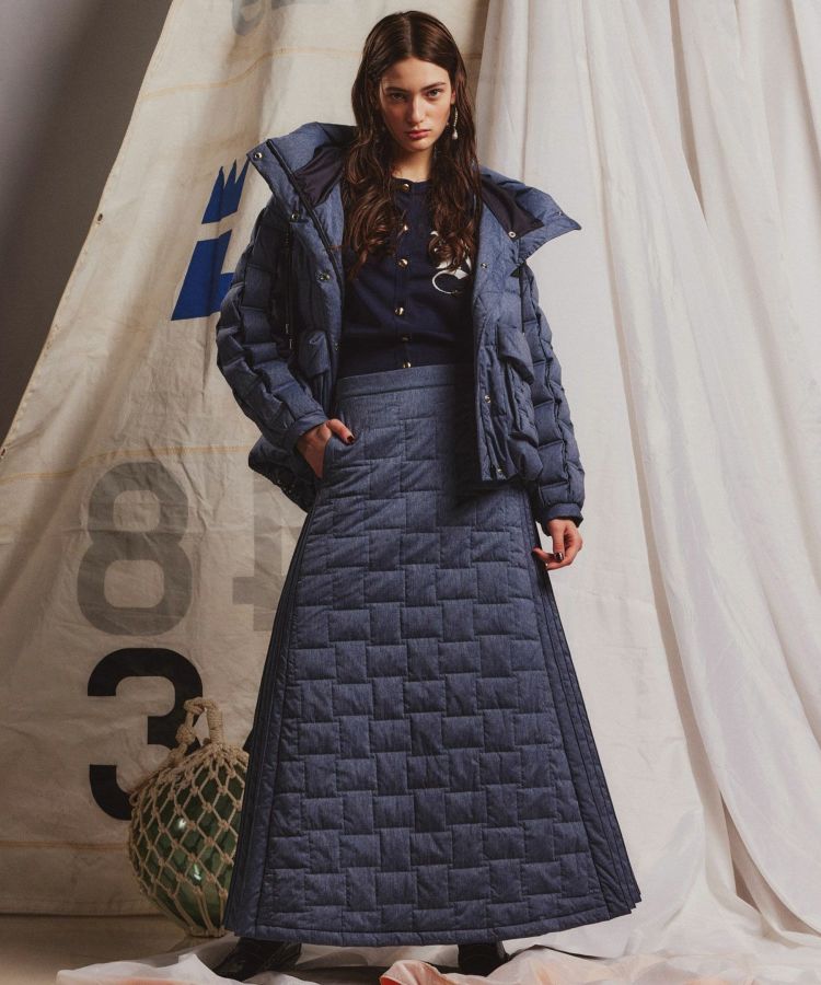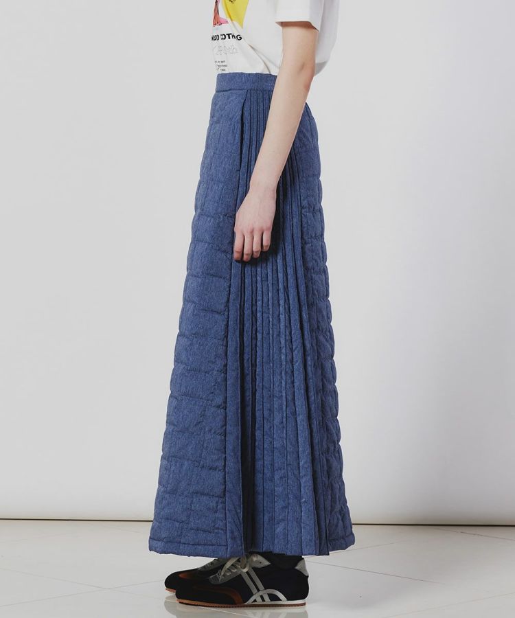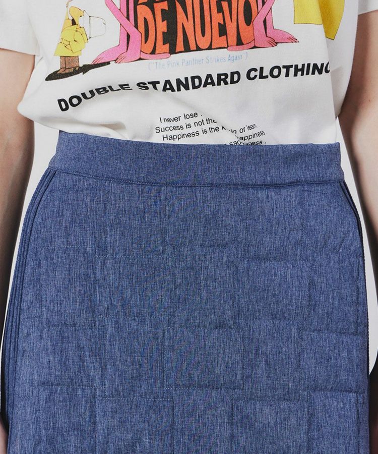 デニムライクなプリントを施した、タフタ生地のスカート。ステッチでプリーツのように見せるダブスタならではのイントレチャートのテクニックで、デザイン性のある一着に仕上げました。サイドはラインデザインで、スタイル良く見せてくれるのもうれしいポイント。これひとつでインパクトのあるコーディネートが完成するアイテムです。