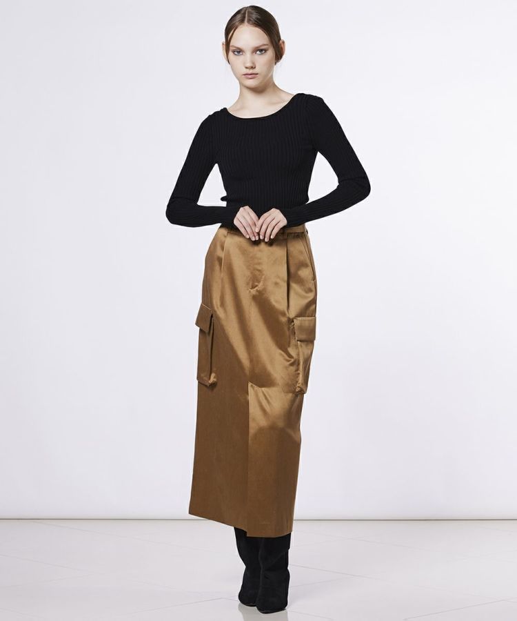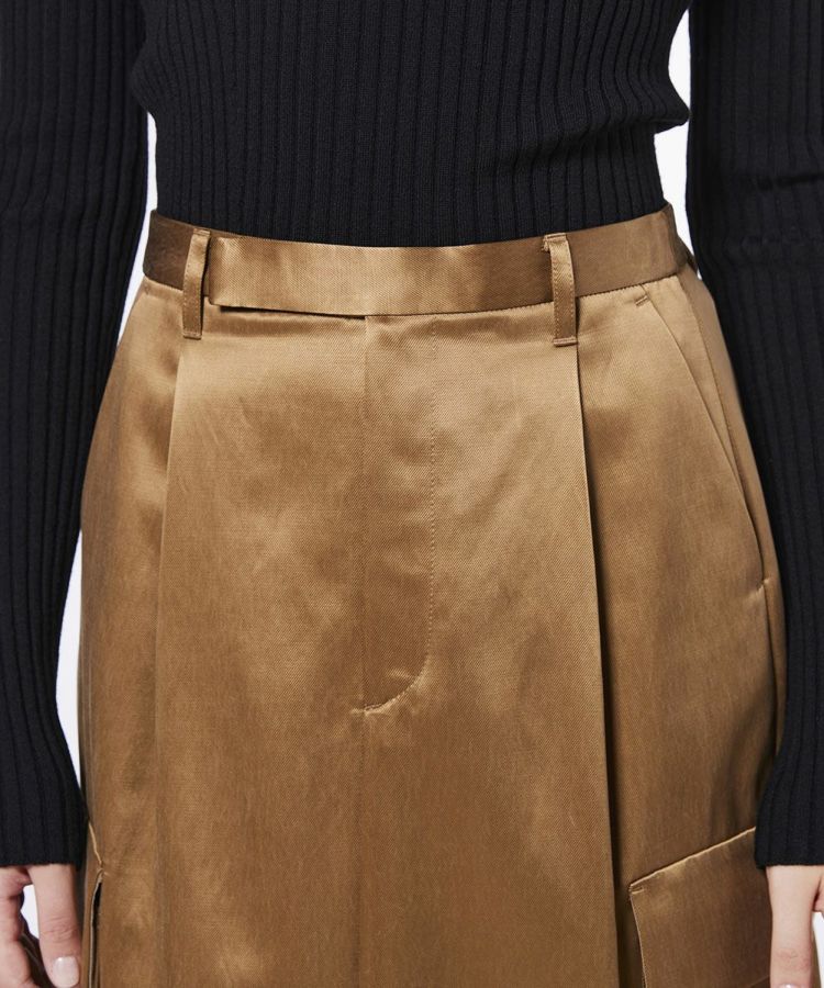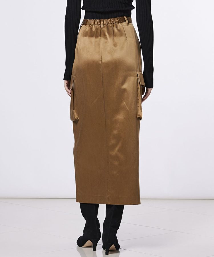 上品な光沢感と美しいドレープを併せ持つキュプラ素材を使用したスカート。センターに大胆なスリットを施すことで、歩きやすさとセンシュアルな印象を同時に実現しました。ウエストのバック部分にはゴムを入れ、快適な履き心地も確保。両サイドのビッグポケットがデザインのアクセントになり、大人カジュアルに着こなせるアイテムです。
