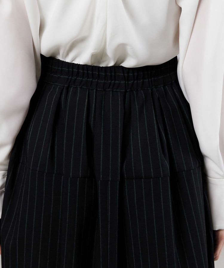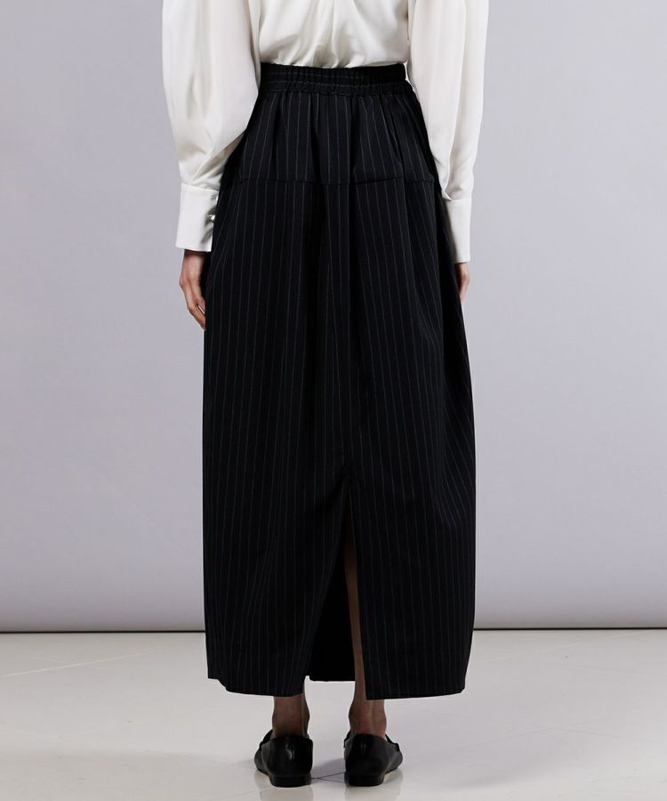 軽やかなドライタッチの平織素材を使用したシンプルなロングスカート。バックにスリットを入れたことで歩きやすさにも配慮しました。ウエストはゴム仕様で履き心地も楽ちん。落ち着いたカラーリングとストライプ柄が、シーンを選ばず幅広いスタイリングで活躍します。