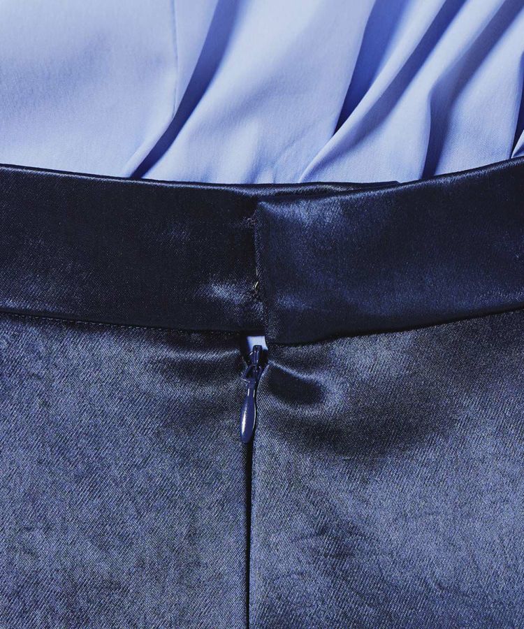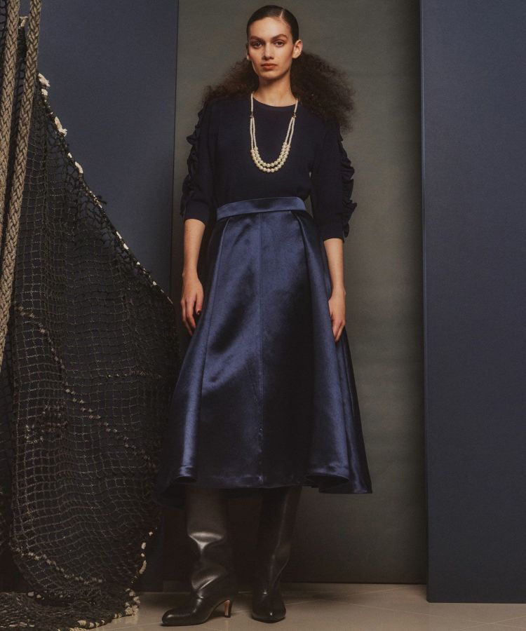 自然な柔らかさのあるサテン生地を使った、優しい表情のロングスカート。ふっくらとした表面感と、ボンディング加工によるハリ感で美しいシルエットを実現しました。ゆったりとしたドレープが優雅で、縦のラインが脚長効果をもたらしてくれるのもうれしいポイント。タイトめのトップスを合わせると、全身にメリハリのあるスタイルが楽しめます。