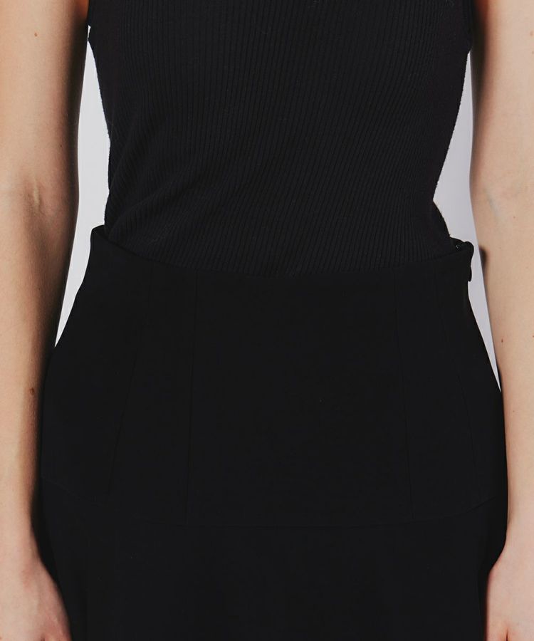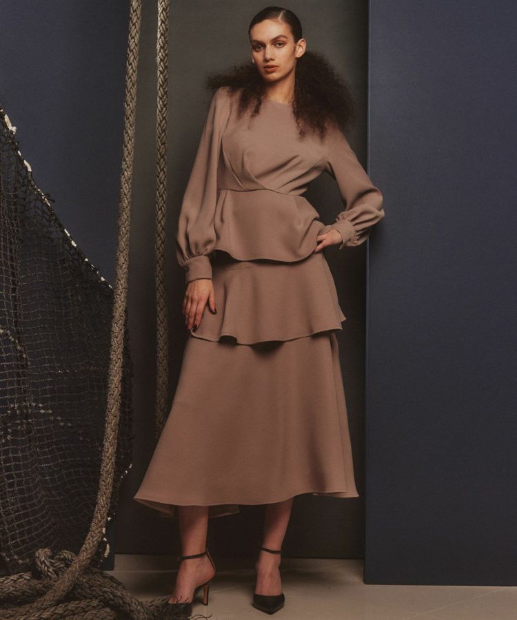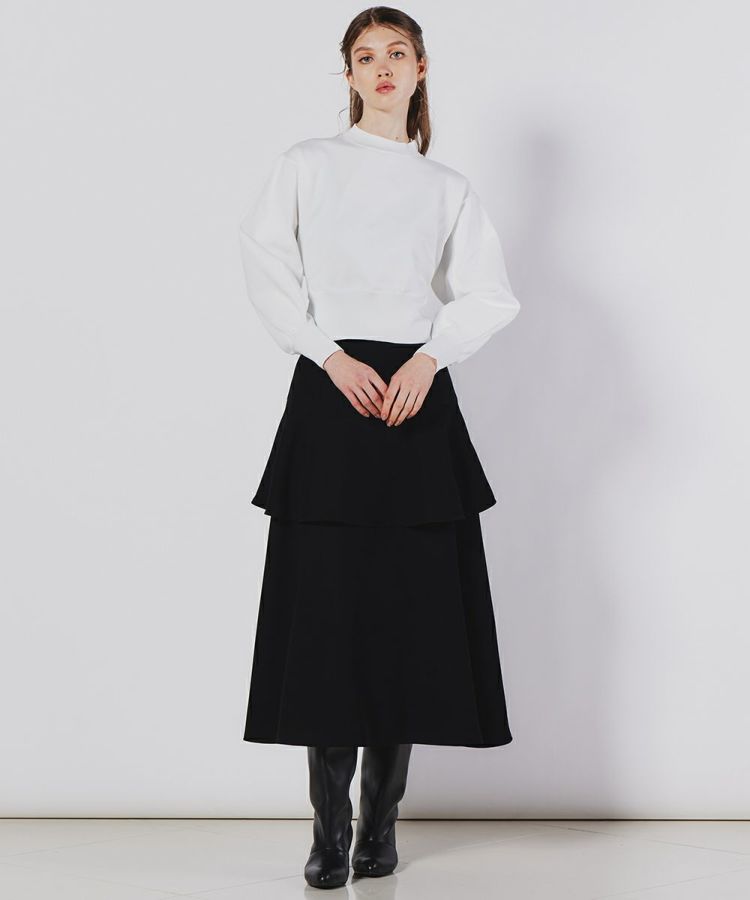 濃染加工に優れた糸で高密度に織り上げた、ダブルクロス素材のスカート。切り替えによるティアードシルエットが優雅なムードを演出します。ウエストまわりはすっきりとさせ、ハイウエストで脚長効果も抜群。同素材のブラウス(型番:0304420243)と合わせるとワンピース見えするのでおすすめです。