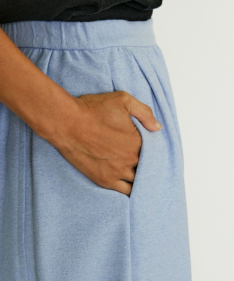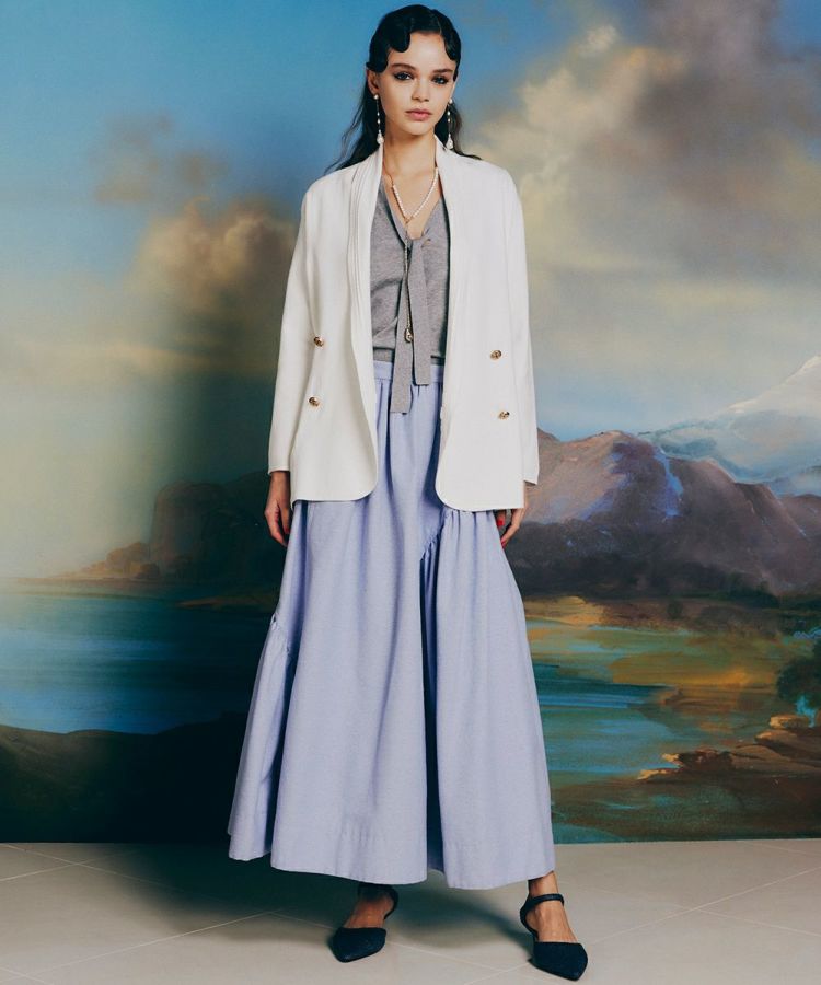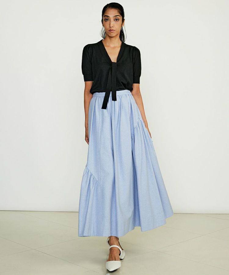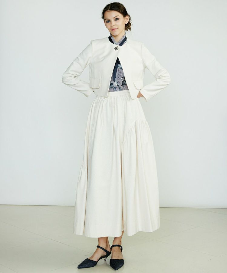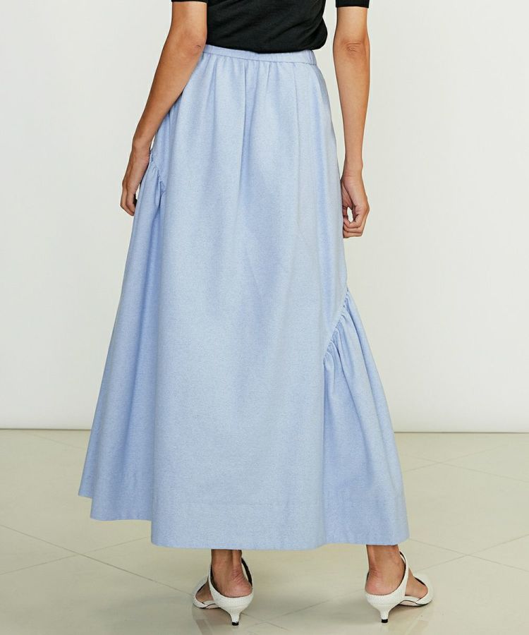 イレギュラーに切り替えデザインを施し、変化のあるギャザーを作ったスカート。ロング丈でシルエットがきれいに広がるので、シンプルながらも一枚でサマになるのが魅力です。ショート丈ジャケットなどと合わせると全身がバランス良くコーディネートできるのでおすすめ。同素材の