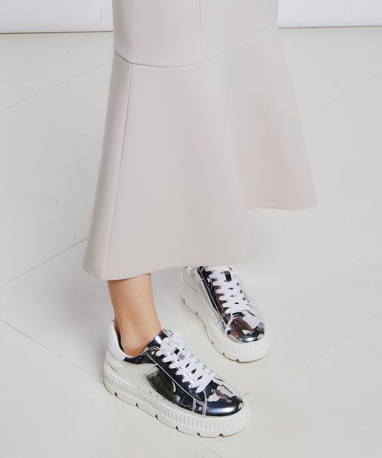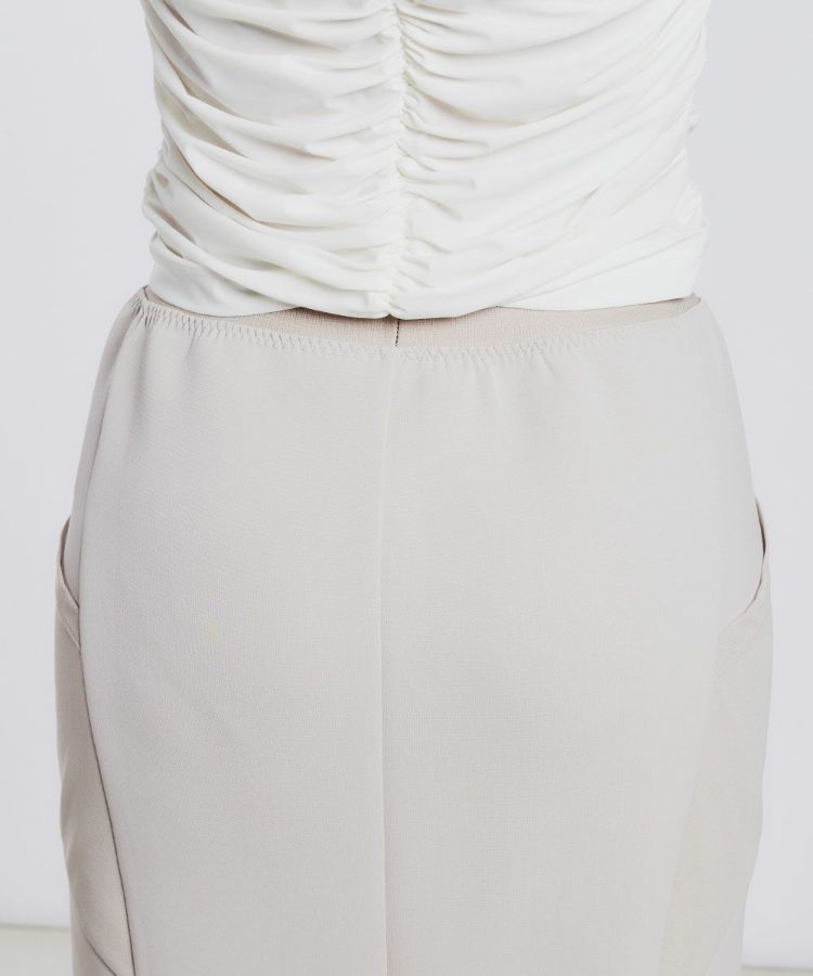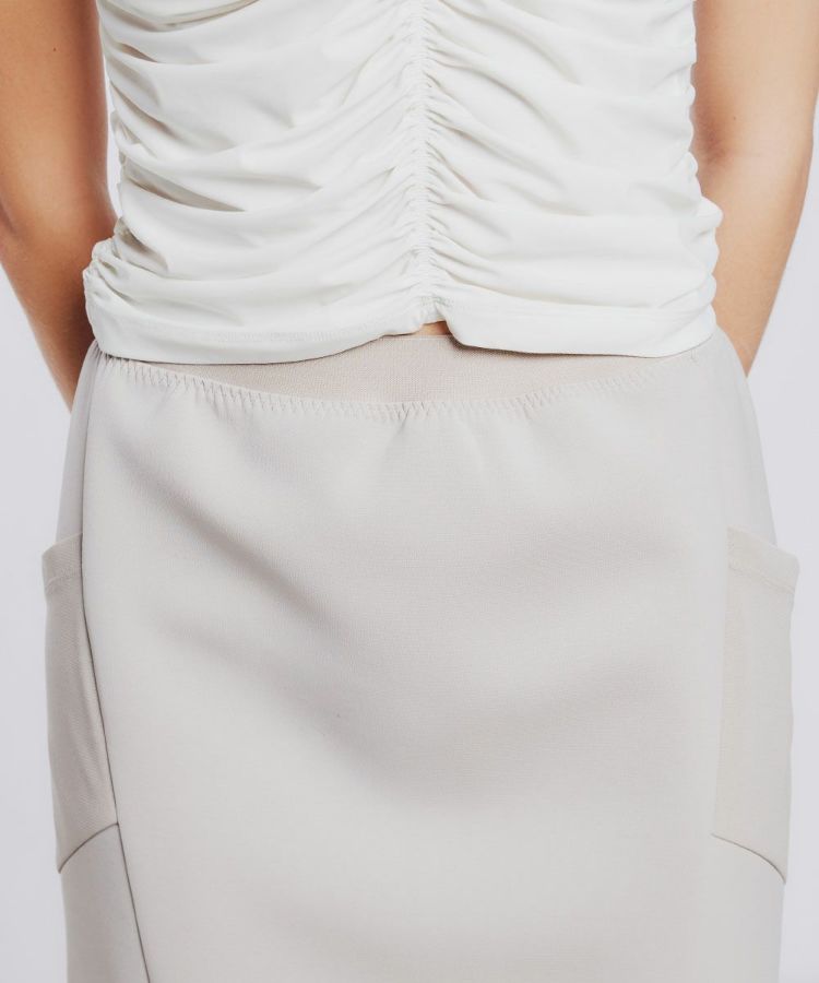 なめらかな表面感とふんわりとしたふくらみ感が特徴のダンボール生地を使用したマーメイドシルエットのスカート。きれいめな印象を与えてくれるため、お手持ちのTシャツやスウェットに合わせるだけで大人カジュアルなコーディネートが叶います。また、ストレッチ性があるため着心地は抜群。ポケットがシースルーになっているのもさりげないポイントです。