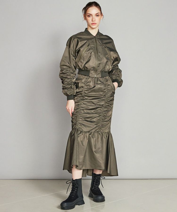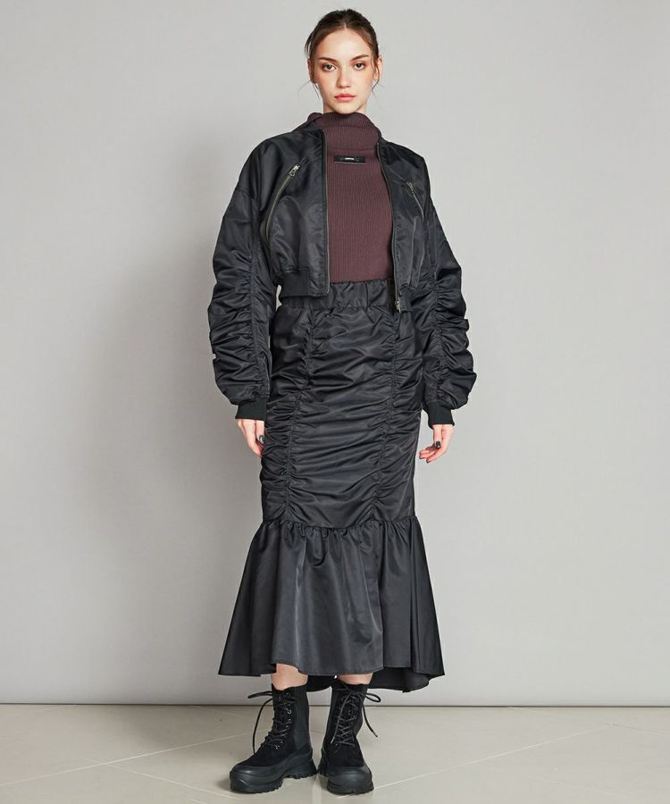 光沢感があり、程よい厚みと柔らかさが特徴のナイロンツイル生地で作ったマーメイドスカート。ハードな印象になりやすいアイテムですが、切り替えを利用してギャザーをたっぷりと入れることで、シンプルなトップスと合わせても女性らしく仕上がります。ウエストは後ろゴム仕様で、イージーな穿き心地なのもうれしいポイント。