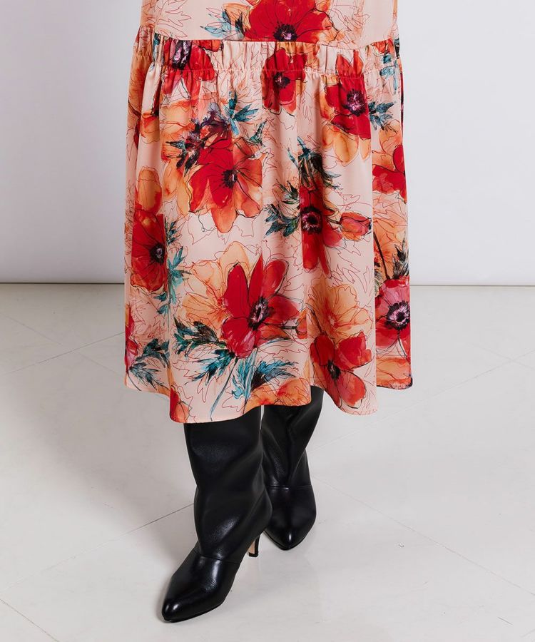 オリジナルのフワラープリントが華やかなワンピース。ショルダー部分にはギャザーを寄せ、ボリューム感を出してモードな雰囲気に。ローウエストにすることで抜け感を出し、デイリーに使いやすいように仕上げました。袖口はタックを施しているため、袖をまくったときにぴったりフィットし手元をきれいに演出してくれます。