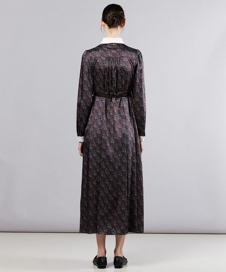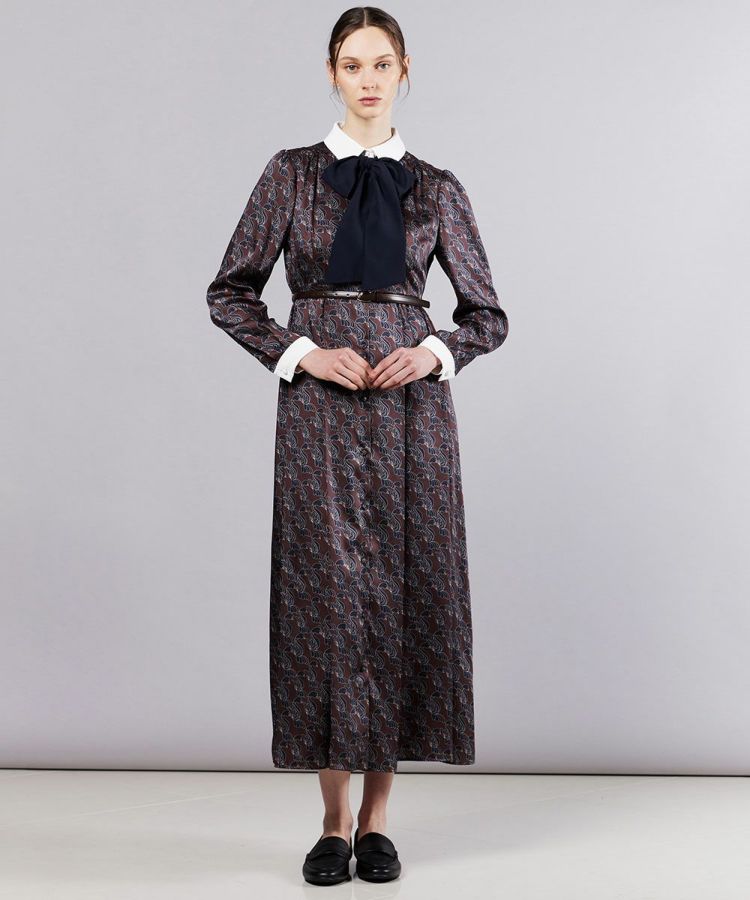 胸元のリボンタイと落ち着いたカラーリングがクラシカルな佇まいのワンピース。全面にあしらったスワン柄が、大人かわいい雰囲気を演出してくれます。スカート部分にはプリーツ加工を施し、動くたびにふんわりと広がる美しいシルエットに。白襟とカフスが全体を引き締め、より上品でエレガントな印象をプラスします。日常使いはもちろん、ちょっとしたお出かけや特別な日にも活躍する一着です。