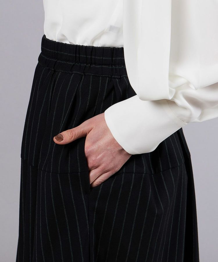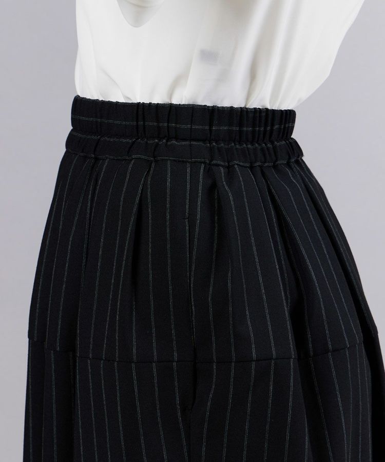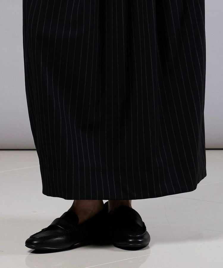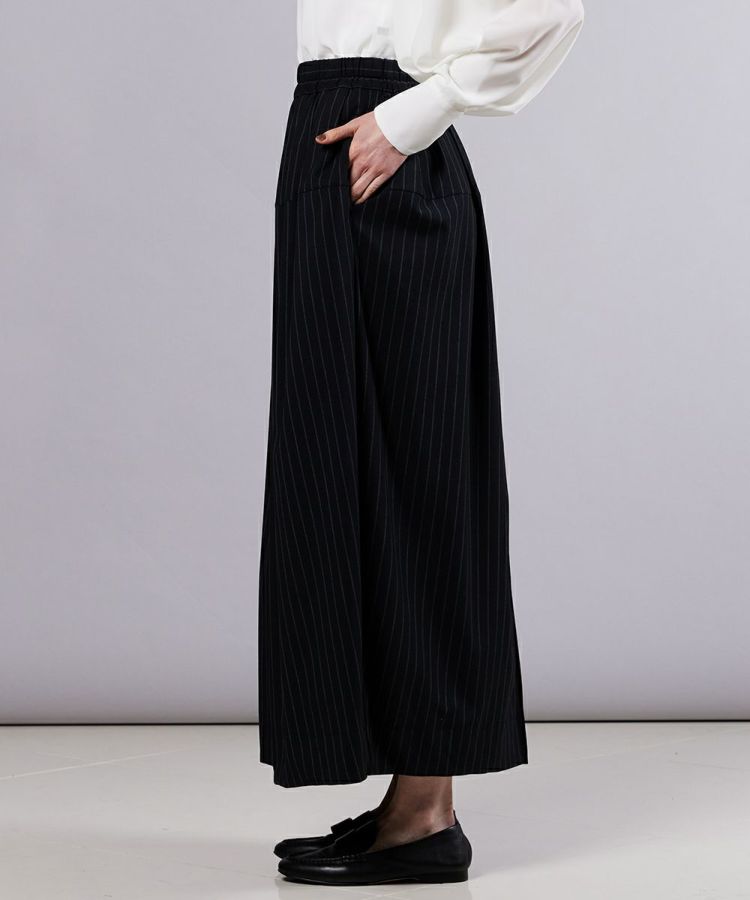 軽やかなドライタッチの平織素材を使用したシンプルなロングスカート。バックにスリットを入れたことで歩きやすさにも配慮しました。ウエストはゴム仕様で履き心地も楽ちん。落ち着いたカラーリングとストライプ柄が、シーンを選ばず幅広いスタイリングで活躍します。