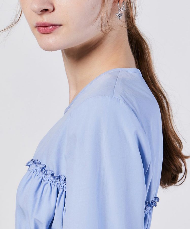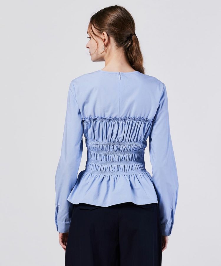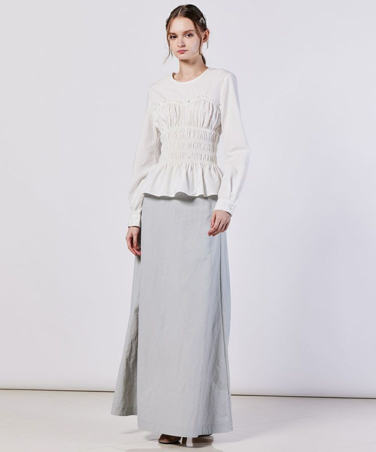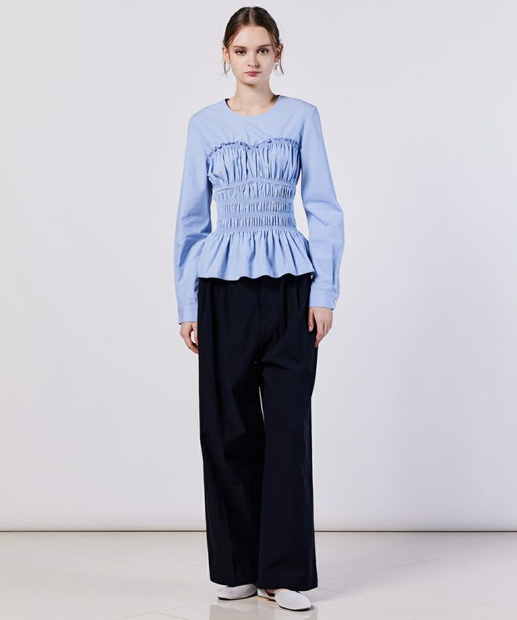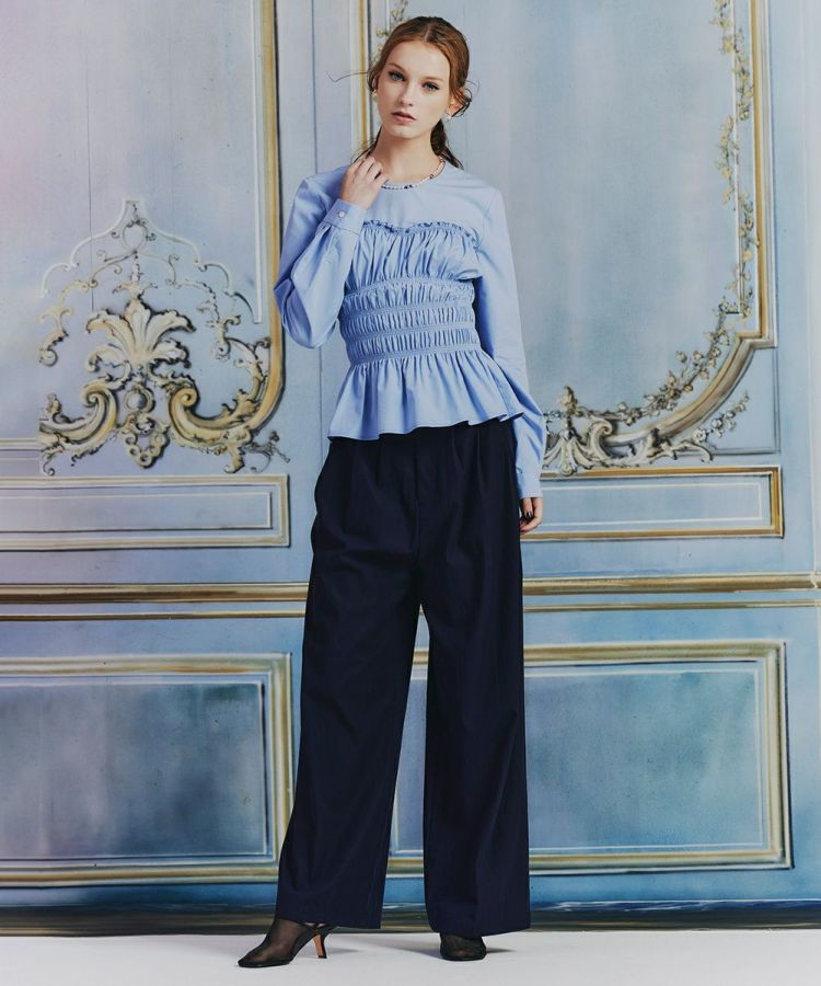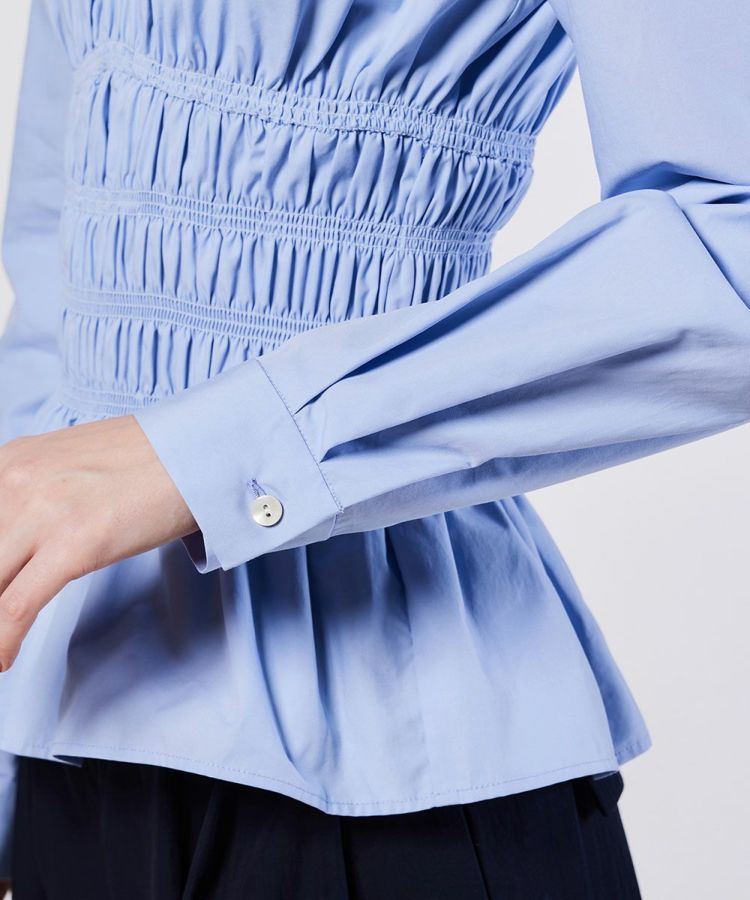 シャーリングのデザインとペプラムになった裾がフェミニンな印象を与えてくれるブラウス。シルエットにもメリハリができるので、パンツを合わせてもスカートを合わせても、全身をスタイル良く見せてくれるのが魅力です。また、パリッとしたハリのある生地感もポイント。柔らかな印象ながらもきちんと感が出るので、オフィスコーデにも取り入れられます。