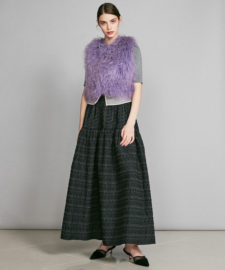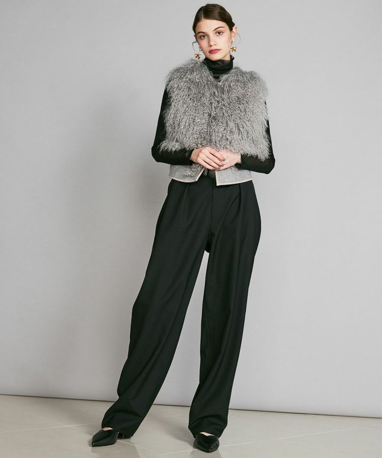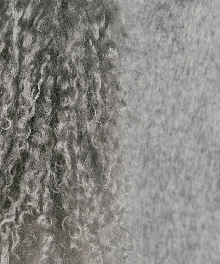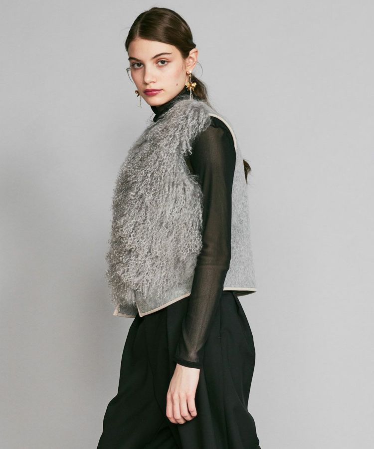 ふんわりとしたボリューム感がかわいいファーベスト。毛皮によくある刺し毛は存在しないタイプで、根元はストレート、毛先はカールした巻き毛を使用しています。マフラーなどに使われるチベット地方が原産のウールを採用し、5~8cmの長めの毛足が特徴。白い毛をブリーチしてから染めることにより、都会的な雰囲気に仕上げているのが新鮮です。リッチ感があるのでシャツやタートルネックに合わせるだけでコーディネートに華を添えてくれるアイテムです。