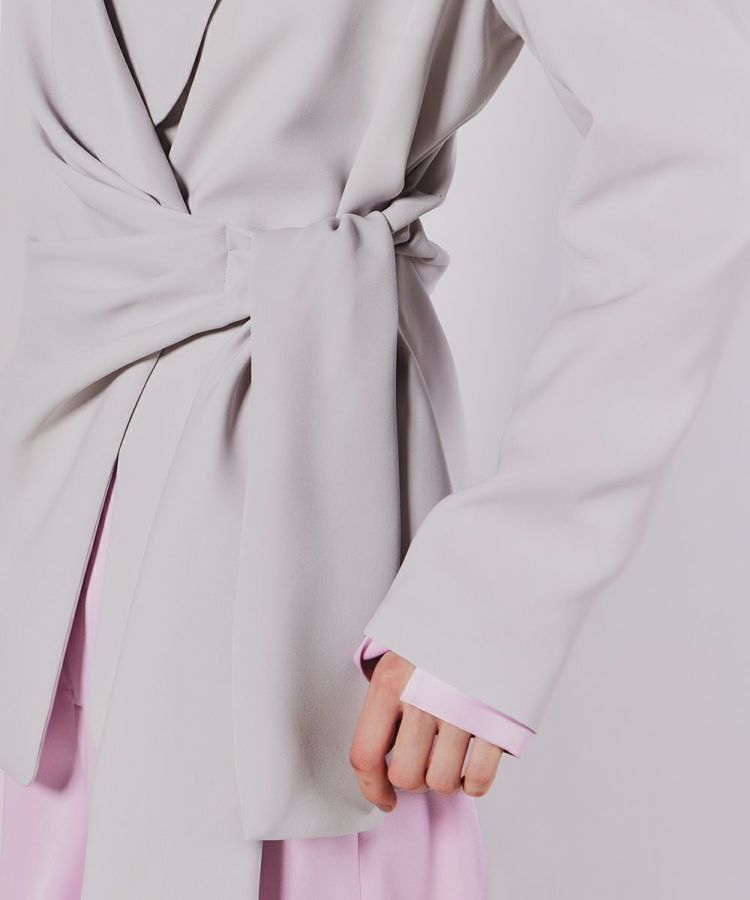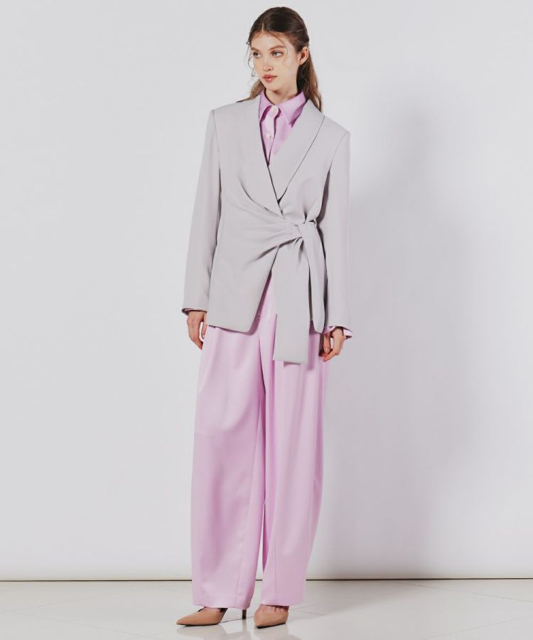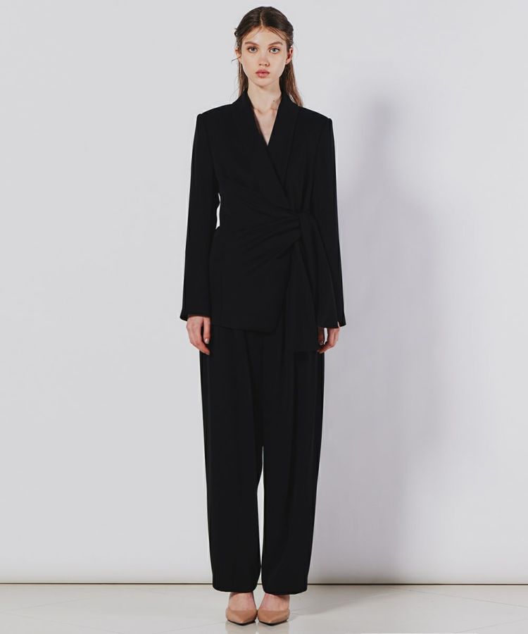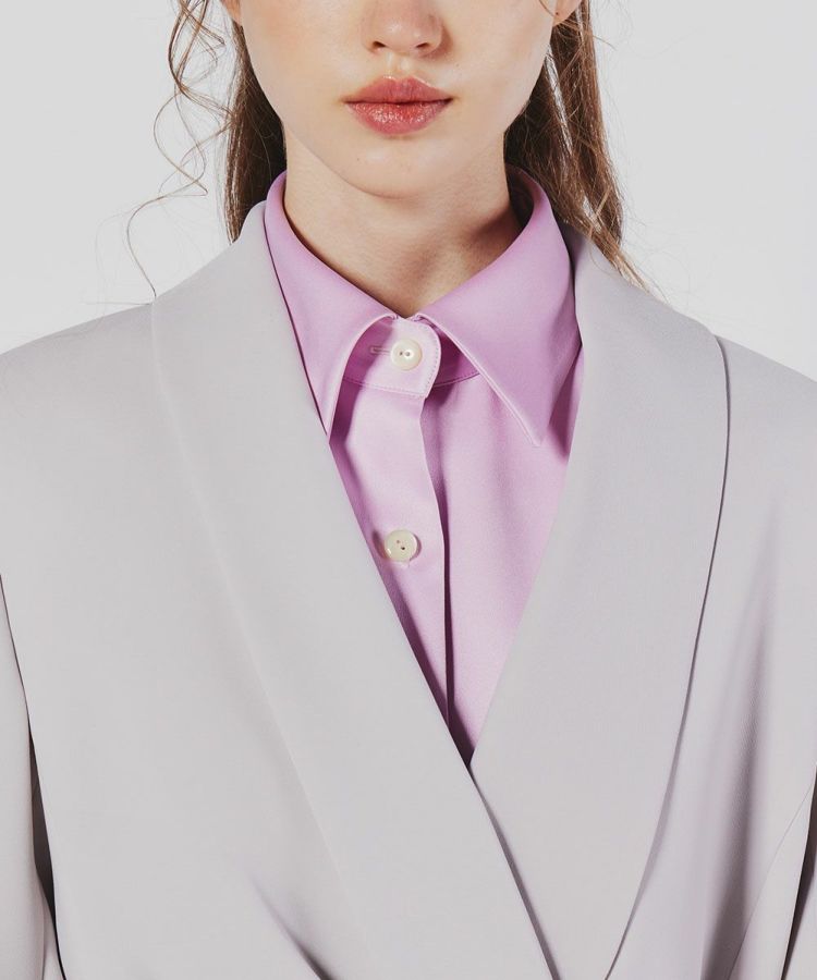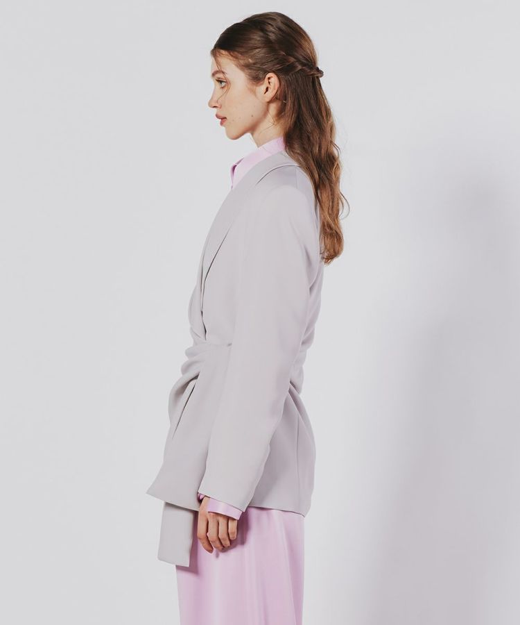 ドライタッチかつ伸縮性のある糸を使用した、ダブルクロスのジャケット。アシンメトリーなドレープがユニークなシルエットを作り出し、リラクシンなこなれ感を演出します。デザイン性がある一着のため、シンプルなインナーやパンツに合わせるだけでサマになるのが魅力的。上品な表情のある素材感もポイントになっています。