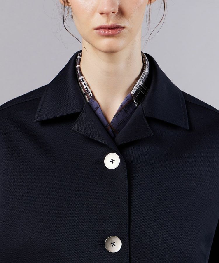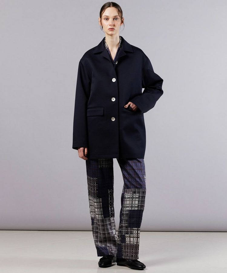 独特の膨らみとハリ感が特徴的なポリエステルツイル素材で仕上げたアウター。程よく厚みがありながらも着心地は軽やかに仕上げ、長時間着用してもストレスなく過ごせます。肌なじみの良いネイビーカラーが落ち着いた大人の上品さを演出。ミドル丈のすっきりとしたシルエットとシンプルなデザインは、カジュアルからきれいめまで幅広いコーディネートにマッチしてくれます。