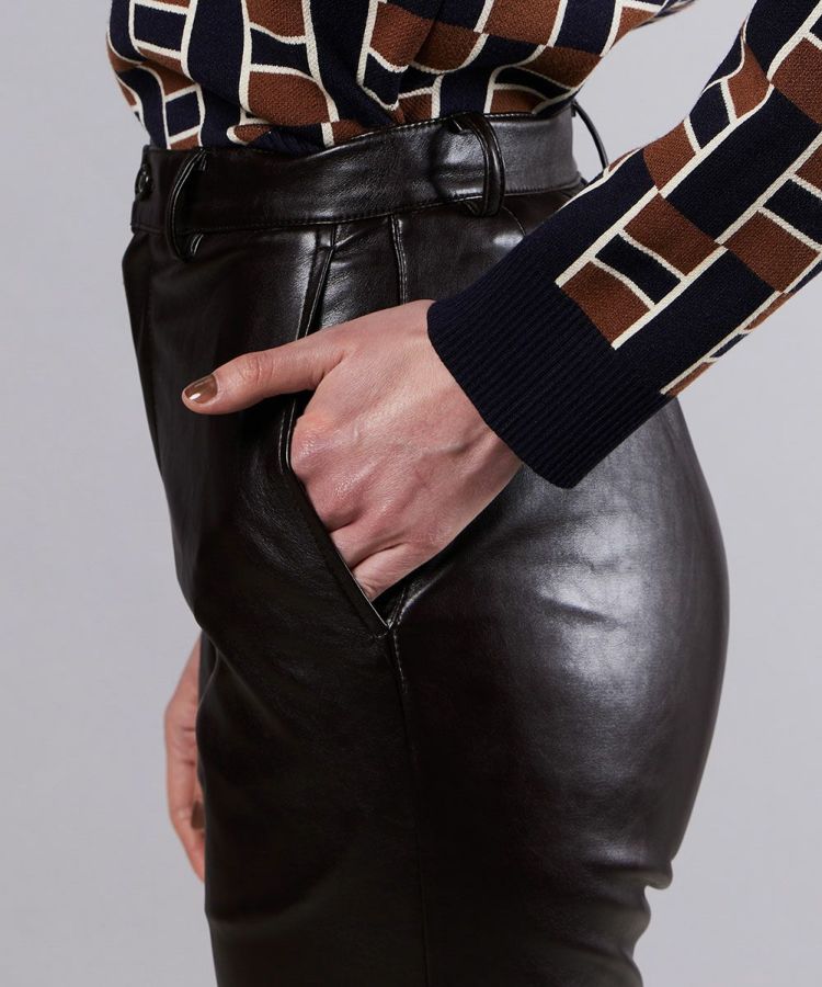 レザーライクな質感がクールな印象を与えるスキニーパンツ。柔らかく肌なじみの良い合成皮革にエンボス加工を施し、ヴィンテージ感のある表情豊かな風合いに仕上げました。脚のラインを美しく見せるスリムなシルエットと、上品な光沢感がスタイリングをワンランクアップ。ハンサムライクな着こなしから、女性らしいスタイルまで幅広い表情が楽しめる万能なアイテムです。