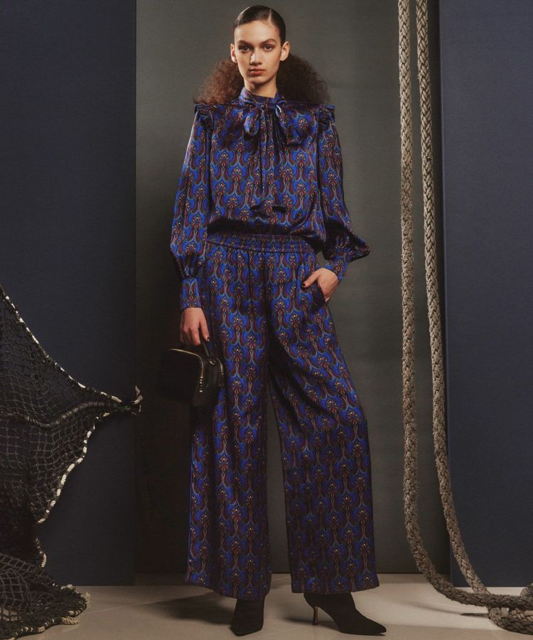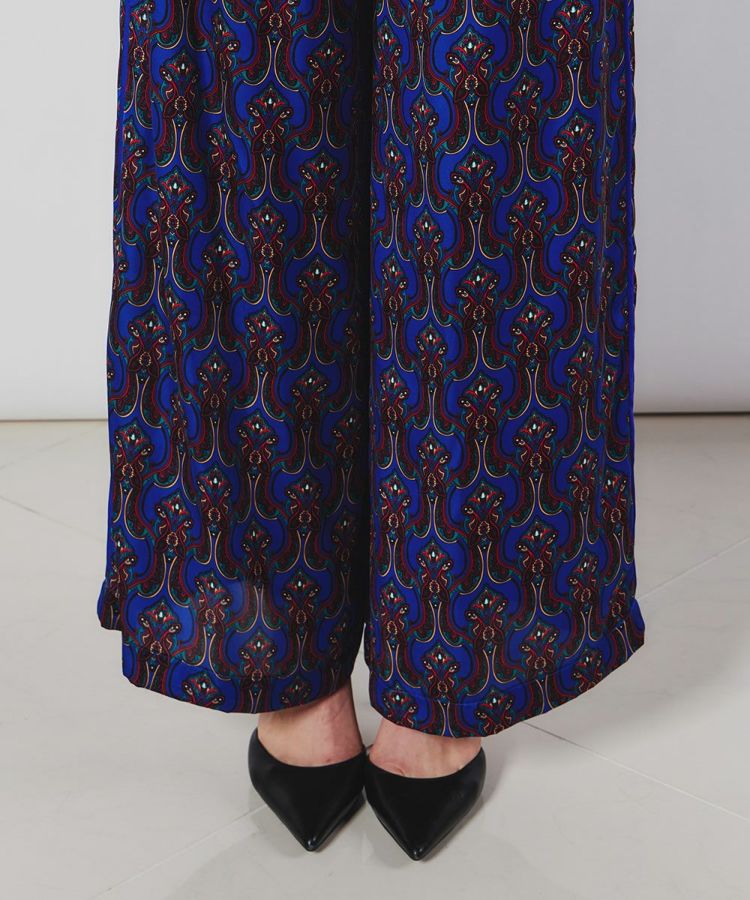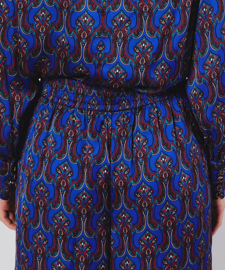 柔らかなポリエステルサテン生地を使用したパンツ。ペイズリー柄をプリントし、華やかに仕上げました。ボディラインを拾わず、きれいなシルエットで穿けるのも魅力的。ウエストはゴム仕様になり、穿き心地は楽チンです。同素材(型番:0304500243)とセットアップで着用するのはもちろん、あえてカジュアルなパーカーやニットトップスと合わせるのもおすすめです。