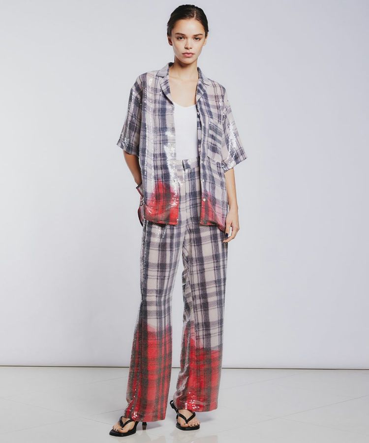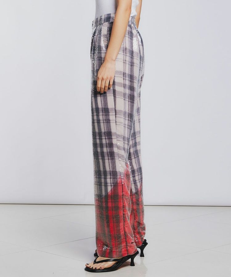 ペイント加工を施したネルシャツのような模様を、全面スパンコールで表現した贅沢なパンツ。ラフなシルエットながらも、スパンコールの輝きが唯一無二の存在感を放ちます。裾に赤いペイント加工風をあしらいアクセントに。同素材のシャツ(型番0304540241)とセットアップで着こなして欲しいアイテムです。